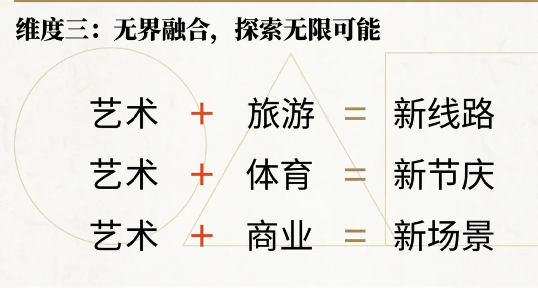 探索融合的无限可能。当艺术遇见旅游,遇见体育,遇见商业,我们将创造出“艺术+旅游”的新线路,“艺术+体育”的新节庆,“艺术+商业”的新场景。