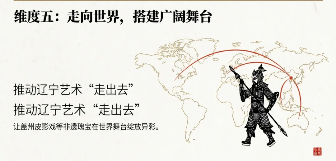 搭建文化交流的广阔舞台。继续推动辽宁艺术“走出去”,让更多像盖州皮影戏这样的辽宁非遗瑰宝,在世界舞台上绽放异彩。
