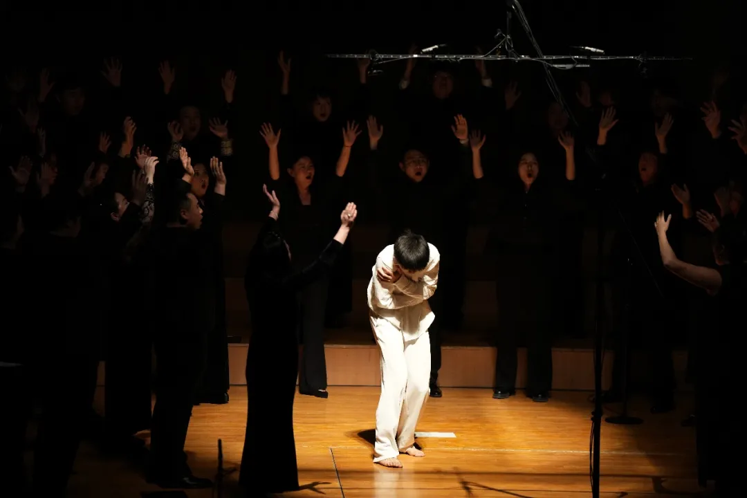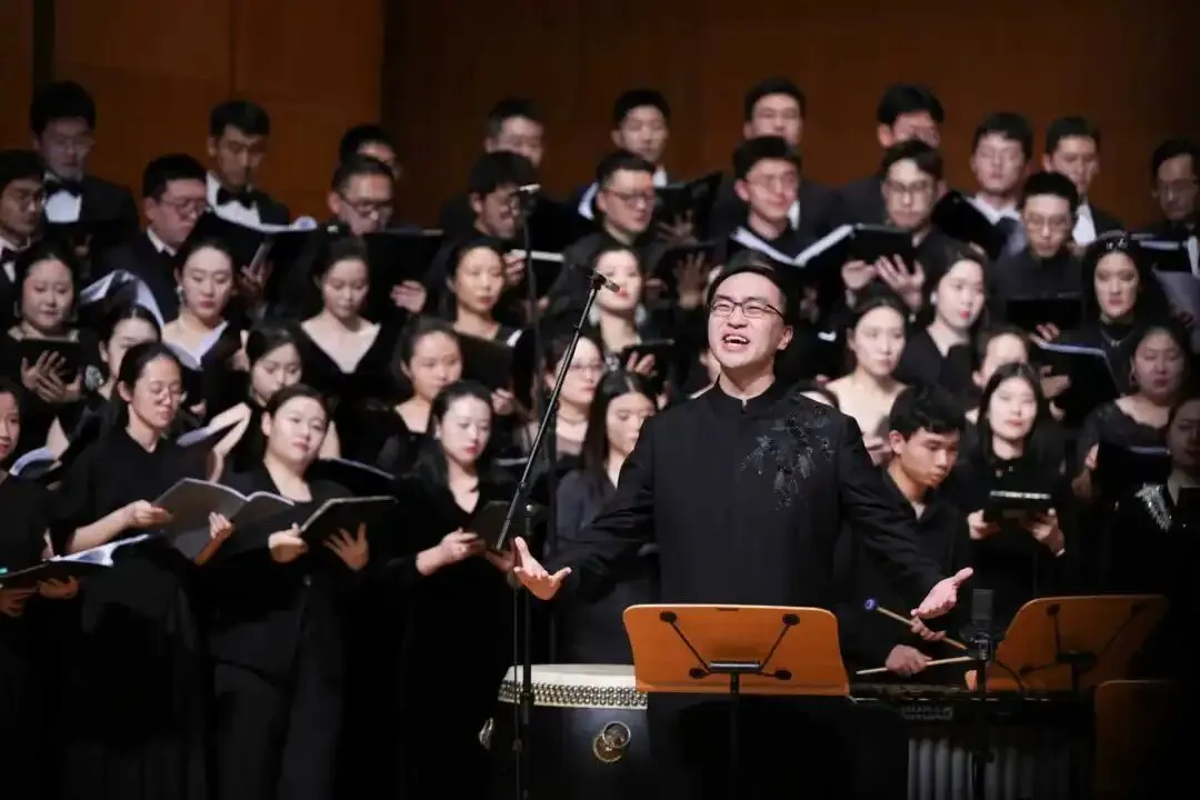 在下半场,和谐之声合唱团与北京青年合唱团、乐谷合唱团共同演绎由中国音乐学院副教授、杭州爱乐乐团副团长、Harmonia驻团作曲家罗麦朔老师的大型合唱作品《玉之音》。这部作品回望了爱国作家郁达夫先生的一生,生动地表现了爱国主义精神。值得一提的是,2018年和谐之声合唱团与山东泉城合唱团在北京音乐厅一起为大家带来的罗麦朔“乐以咏志”作品音乐会上表演了这部作品,2025年的复演同样也获得观众的好评。