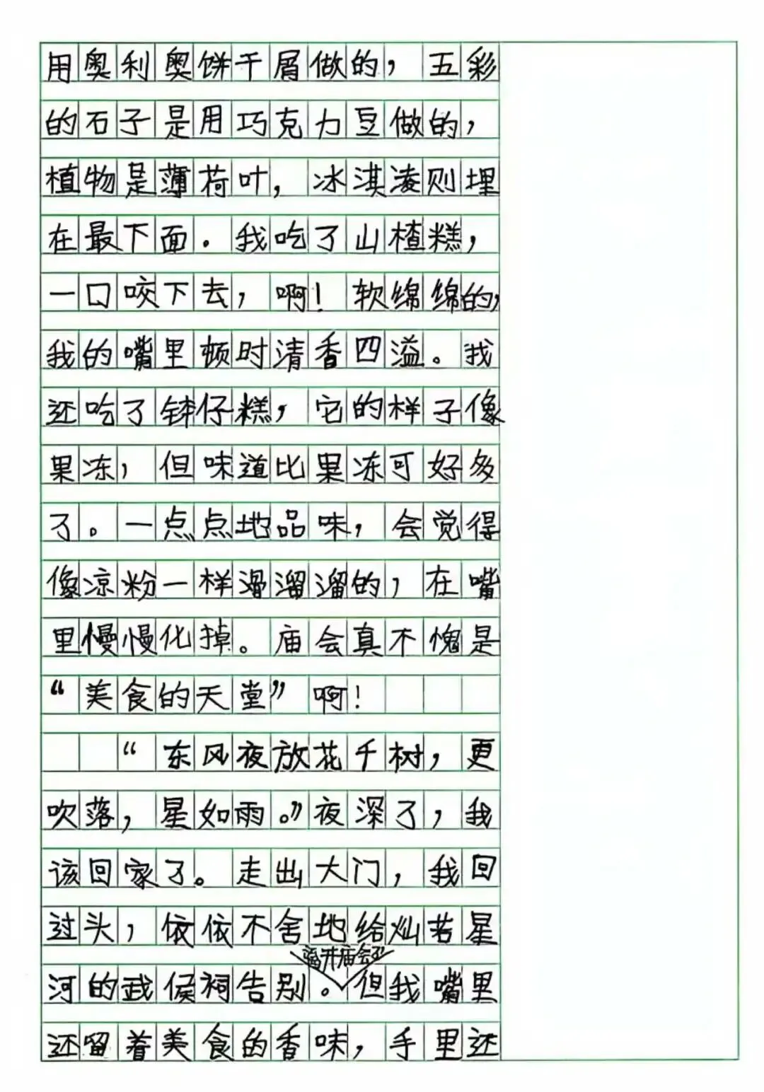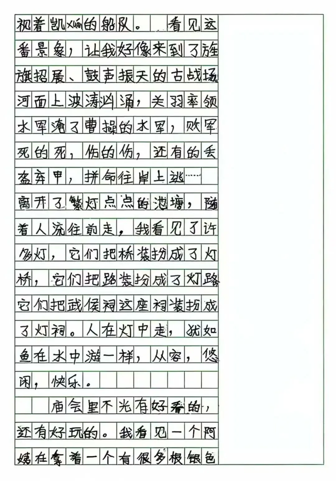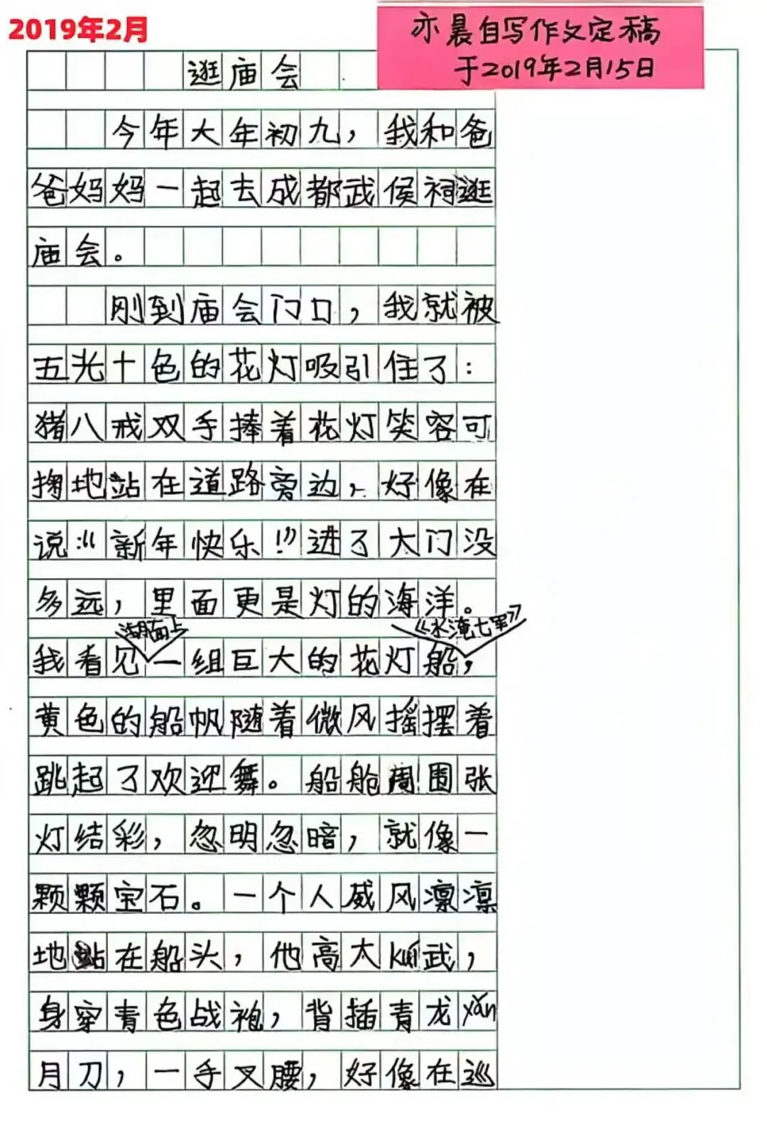 On February 15, 2019, when I was eight years old and in the third grade of primary school, I wrote the composition 《Visiting the Temple Fair》. My mother once recorded the entire process of how this piece was written: I had always loved letting my imagination run free, favoring expressive writing over strict realism. I spent a full two days struggling on my own to shape the idea, then revising it again and again under my mother’s guidance. In the process, I cried and fussed several times, broke down more than once, gave up and then persisted again—until this final draft was finally completed. When the piece was finished, I threw down my pen, hugged my mother, and cheered, wishing I could fly into the clouds like a little bird: “Mom, Mom, I never thought I could write this well!”