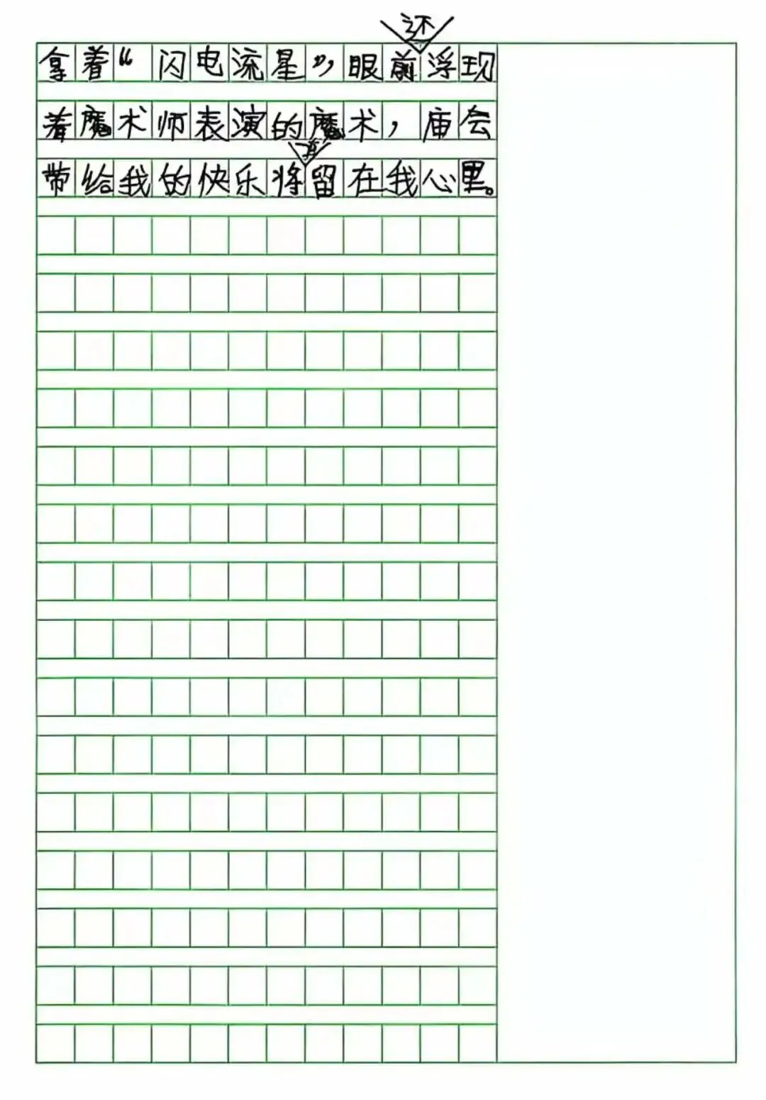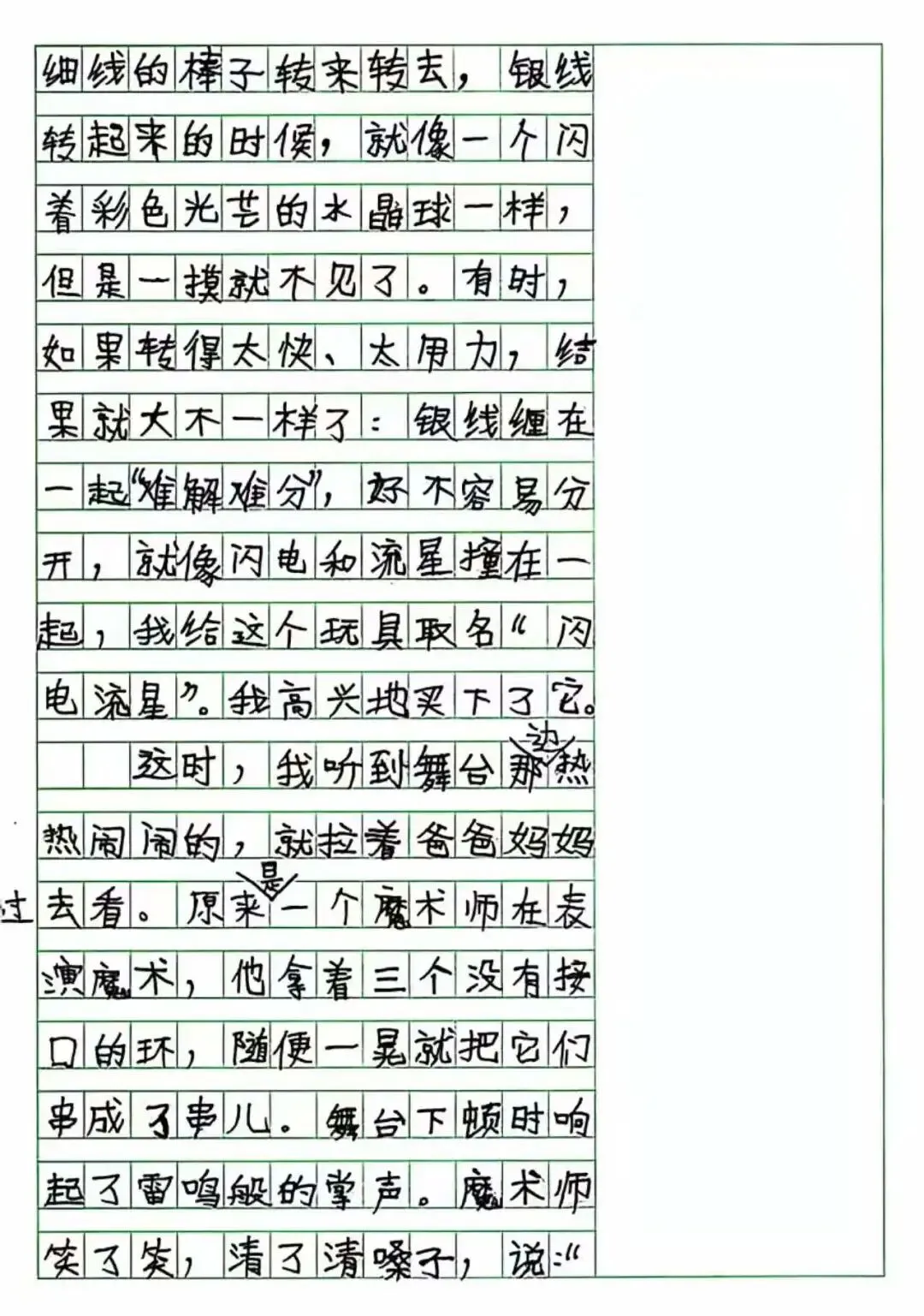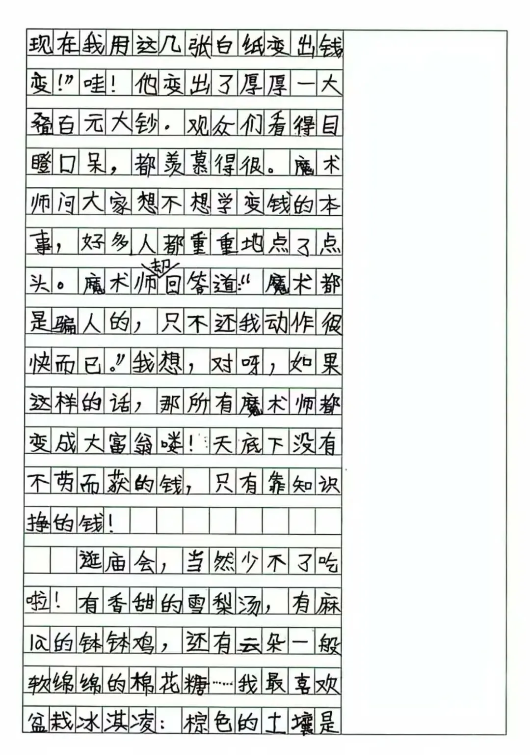 On February 15, 2019, when I was eight years old and in the third grade of primary school, I wrote the composition 《Visiting the Temple Fair》. My mother once recorded the entire process of how this piece was written: I had always loved letting my imagination run free, favoring expressive writing over strict realism. I spent a full two days struggling on my own to shape the idea, then revising it again and again under my mother’s guidance. In the process, I cried and fussed several times, broke down more than once, gave up and then persisted again—until this final draft was finally completed. When the piece was finished, I threw down my pen, hugged my mother, and cheered, wishing I could fly into the clouds like a little bird: “Mom, Mom, I never thought I could write this well!”