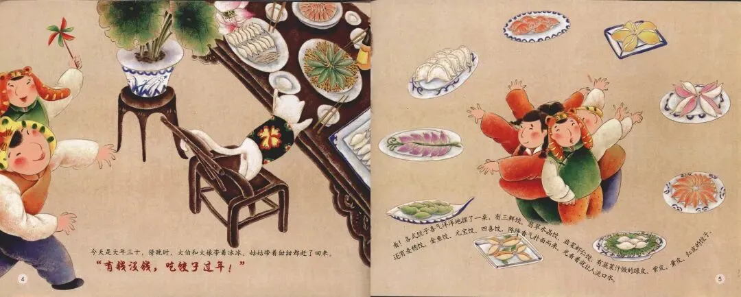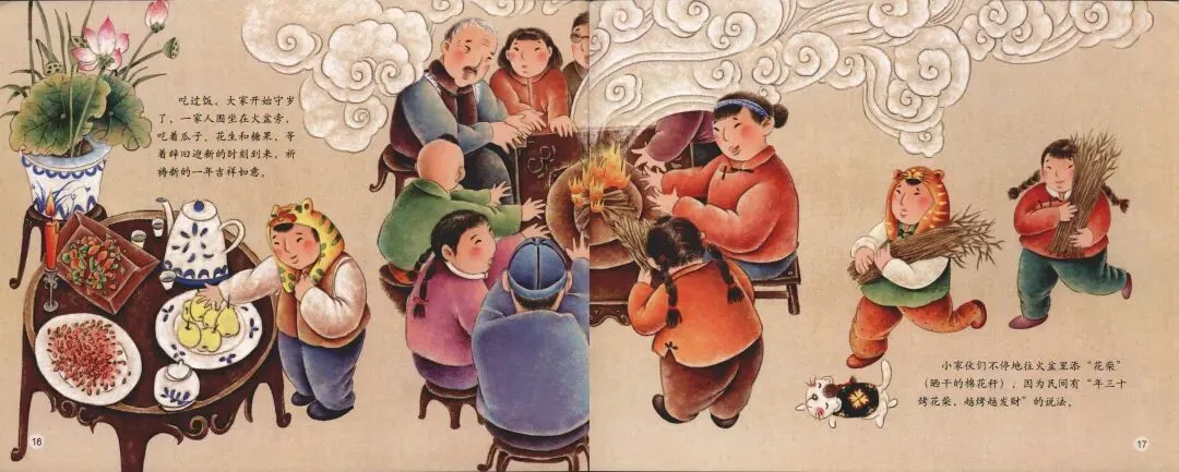 在这本薄薄的绘本里,没有宏大叙事,没有说教口号,有的只是灶台边的一缕蒸汽、火盆里的一簇火星、孩子嘴角的一滴油光;有的只是吃饺子“咯嘣”一声咬到硬币的惊喜、“守岁”时融化在烤花柴中的暖意、除夕时仰望夜空烟花绽放的喜悦……绘本告诉我们:传统并非博物馆里冰冷的展品,而是代代相传的情感记忆。正是这些细碎如尘的瞬间,织成了我们心中最厚重的“年”。
