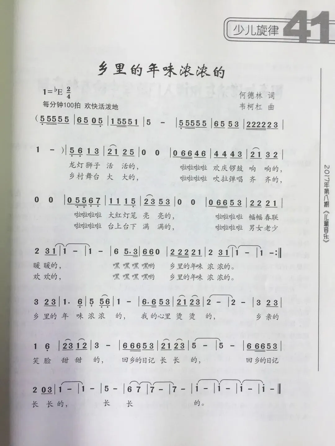 韦柯杠老师的作曲紧紧抓住歌词的内涵,用音乐的语言营造出“浓浓的年味”。四二拍的节奏和稍快的速度下,歌曲情绪欢快活泼。前奏中的大跳和同音反复,使旋律带有很强的节奏感,像锣鼓开场,渲染出节日的热闹气氛。