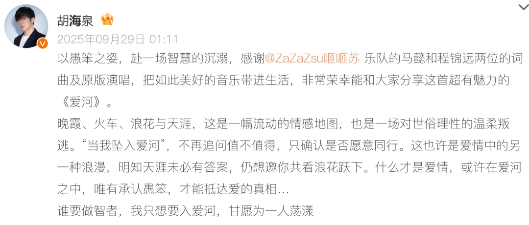 胡海泉曾在微博上发文称,感谢ZaZaZsu咂咂苏乐队的马懿和程锦远两位的词曲及原版演唱,把如此美好的音乐带进生活,非常荣幸能和大家分享这首超有魅力的《爱河》。