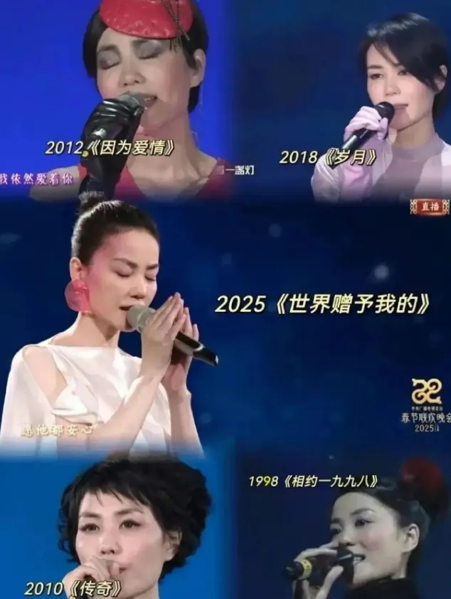 1998年,王菲与那英演唱《相约九八》,2010年,王菲独唱《传奇》,2012年,与陈奕迅合唱《因为爱情》,2018年,时隔20年再度与那英合作《岁月》,2025年,献唱蛇年特别单曲《世界赠予我的》,创收视峰值。