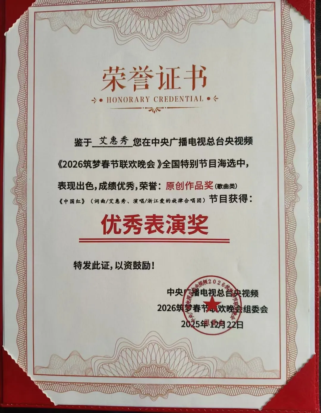 此次合唱团选送的《中国红》,正是艾惠秀创作于2020年的作品。该作品原为参加“唱响中国原创歌曲”赛事而创作,推出后便广受好评,还曾被央视频选中进行专题展播。当得知央视节目组面向全国征集原创作品时,她脑海中再次浮现出这首充满情感与温度的歌曲。“或许,我们可以试试?”她在课堂上问道。