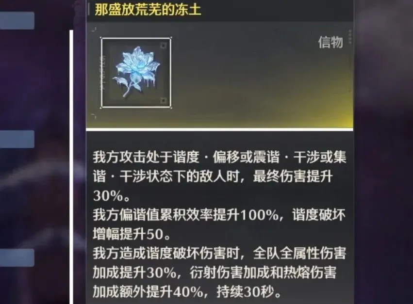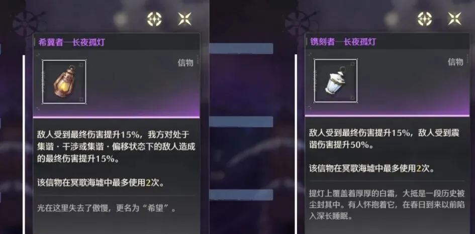 热熔和衍射还可以额外提升40%,效果可谓是非常炸裂;另外四款长夜孤灯信物也是十分好用,镌刻者可以提升角色的震谐伤害、希冀者则是截然相反的集谐伤害加成;