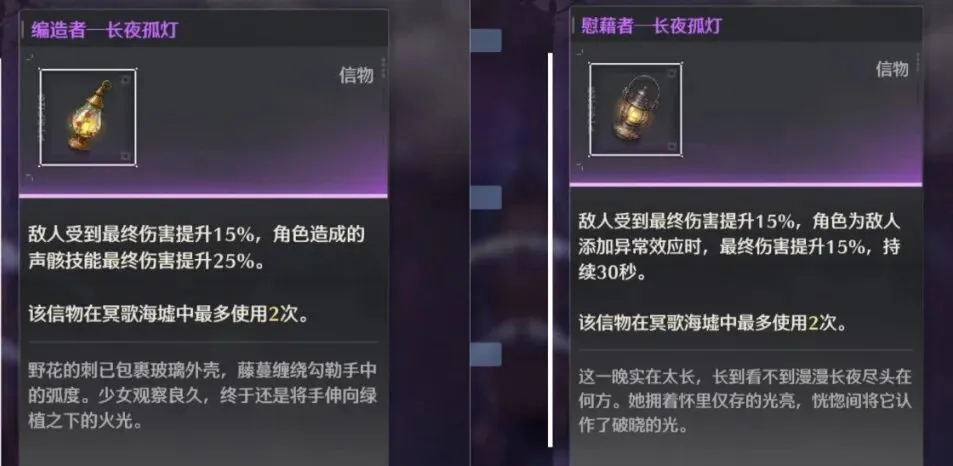 至于编造和慰籍这两款信物,对应的分别是声骸技能伤害加成和异常效应伤害加成,虽然奶雷信物惨遭下架,但是这篇新的长夜孤灯信物感觉更加实用啊!
