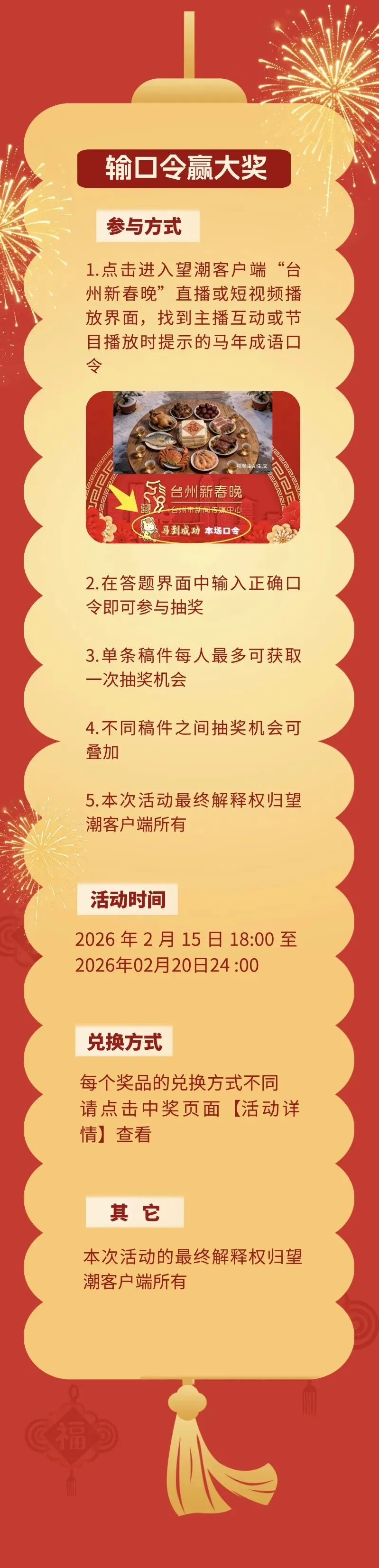2026台州新春播出期间,望潮客户端同步推出“集五福”活动、输口令赢大奖两大活动,总奖金(奖品价值)近8万元,观看直播或短视频均可参与。