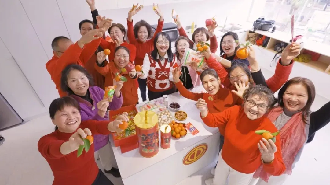 第四次课,街坊们穿上精心准备的新春喜庆服饰,自发带来了各式传统年节食物:金黄酥脆的煎堆寓意“煎堆碌碌,金银满屋”,鲜亮喜庆的年桔象征“大吉大利”,还有油角、糖环等传统小吃摆满了长桌。男女老少分声部合唱,完整演绎了四首歌曲的串烧版:《欢乐年年》的欢快、《财神到》的热闹、《新春颂献》的祝福、《迎春花》的明媚,每一首都被注入了邻里间的真情实感,共同构成了“党群聚人气,邻里共迎春”的动人画面。