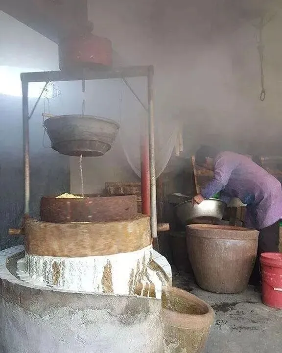 做豆腐过去在农村是一项神圣的事儿。实际从二十四儿晚上就开始了,泡好了豆子,支起晃磨儿,父亲、伯父轮流扎着丁字步,一下一下地晃着。奶奶的铁勺儿一下一下在磨上拨着,那声声撞击,仿佛在凑着一首欢歌,油灯也欢快地跳着。眼看那个场景,心中就会萌生一个希望,何时我也能扎起丁字步呢?