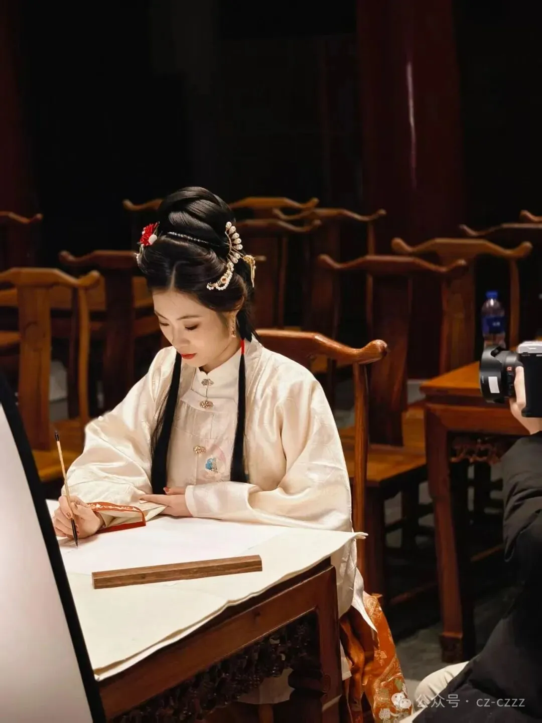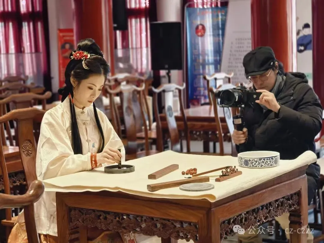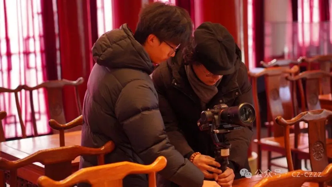 拍摄过程中,我院学生表现亮眼。融媒体影视社团的学生负责摄影拍照、灯光调试。书画艺术专业的学生现场书写《沧州辞》。这首作品的最终呈现,离不开幕后每一位教师的付出,也凝聚着同学们的心血与努力。