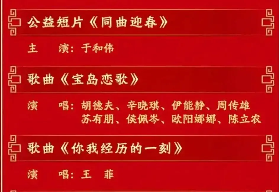 如果我再问你,王菲这首歌前面是哪些节目,有些人可能就没有关注,所以也就没有看懂王菲赋予这首歌新的含义。请看下面的节目表。