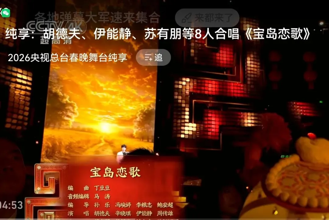 当宝岛歌手唱完《赤足走在田埂上》《小茉莉》《踏浪》和《高山青》之后,表达完“伴随着声声亲切的呼唤,带我走回童年的时光”“小茉莉,请不要把我忘记”“小小的一片云呀,慢慢走过来”之后,大陆也要来“同曲迎春”了。
