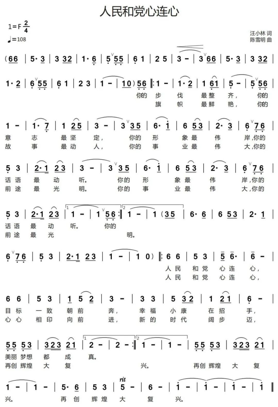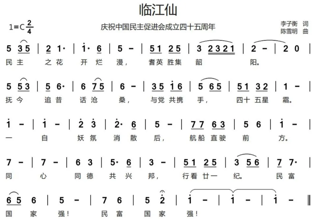 自从邓海清接任主委后,便励精图治,把民进始兴支部搞得风生水起,在民进韶关市委年终评比中,屡屡第一。作为一位最老的会员我也一如既往,积极参与会务活动,本年我作曲的《人民和党心连心》送韶关展播,被选中代表韶关选省展演。我最近在“大清仓”中还找到一首子衡老师作词的《临江仙》庆祝中国民主促进会成立四十五周年的一首我作曲的歌。现公诸于众。
