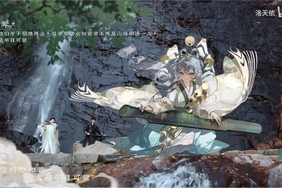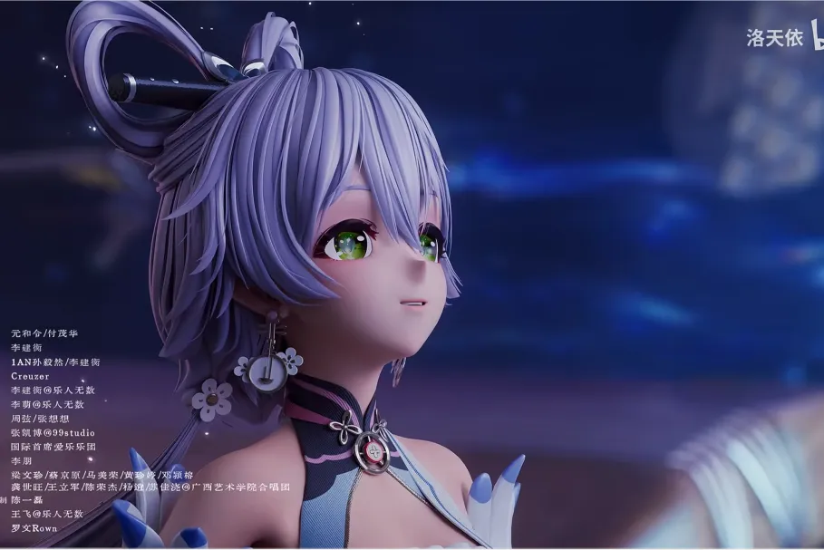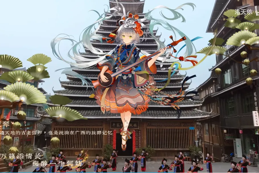 歌词中,“咚”音巧妙化用宫音“Do”,既模拟自然节律与心跳,也象征对东方乐韵最原始的回应。从“时光磨红的手掌”到“一弦一调唤知己”,字句间既是对技艺千锤百炼的致敬,亦是对国乐传承的深情告白。MV中,洛天依身着六套国乐华服,从宋韵南音的簪花围流淌着江南水墨的雅致,到盛唐缺胯袍的礼乐司律跃动着盛世气象,朝代地域的符号与乐器精髓交融,诠释着“地域共感×民间风貌×数字重构”的创作理念。