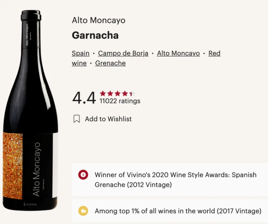 Vivino评其为年度巨佳西班牙歌海娜;