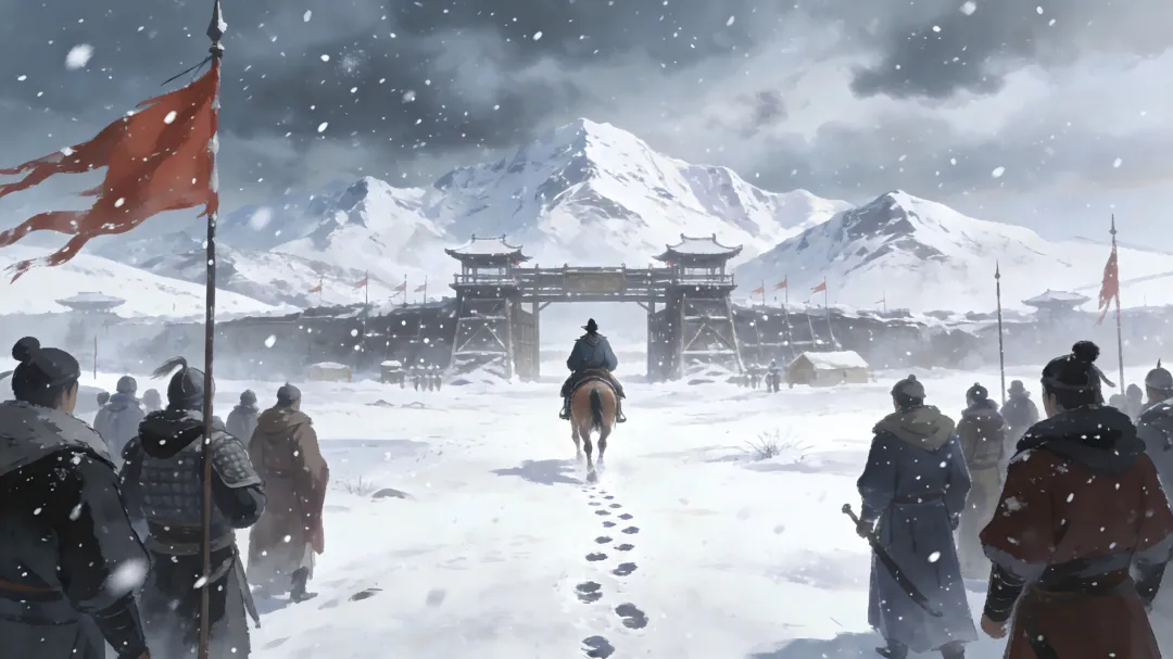 傍晚时分大雪纷纷飘落在营门外,寒风拉扯着红旗,红旗冻住再也不飘动。