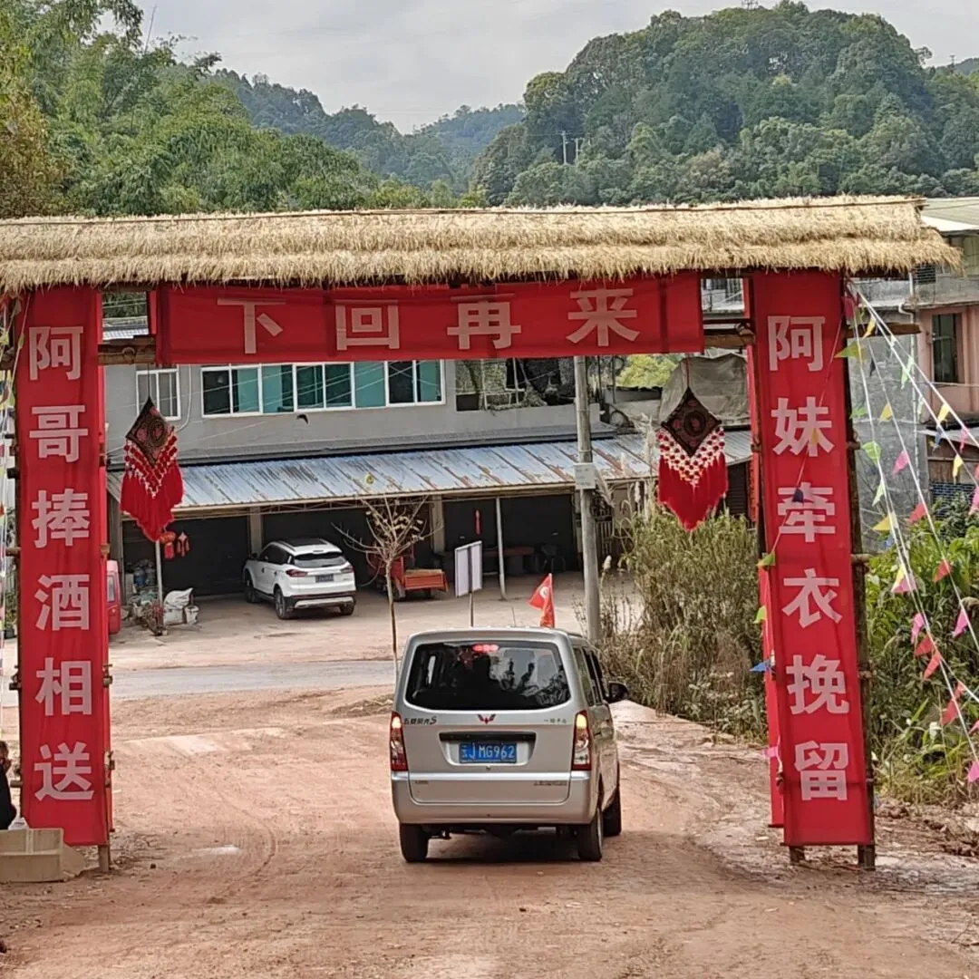 出门的对联是:阿哥捧酒相送,阿妹牵衣挽留。横幅:下回再来。