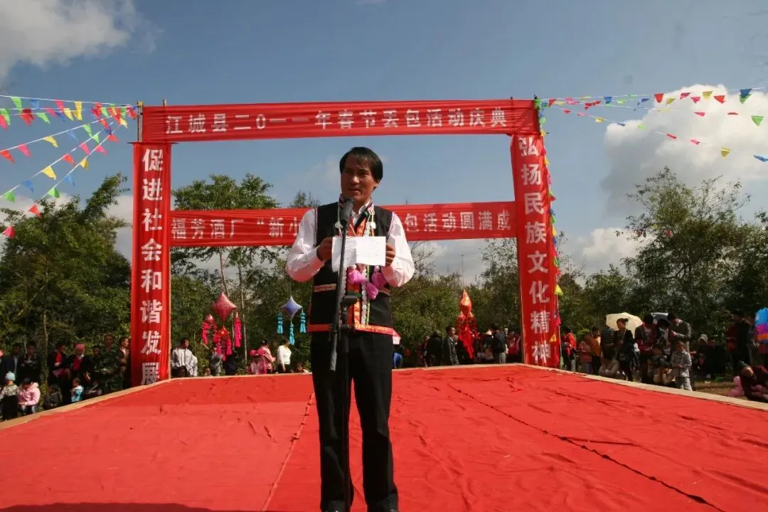 2009年第一届中老越三国丢包狂欢节的时候,我又写了《丢包节节歌——四角丢包牵着你》,由万里作谱,由中央民族歌舞团的江城籍歌手杨倩琳回来演唱。