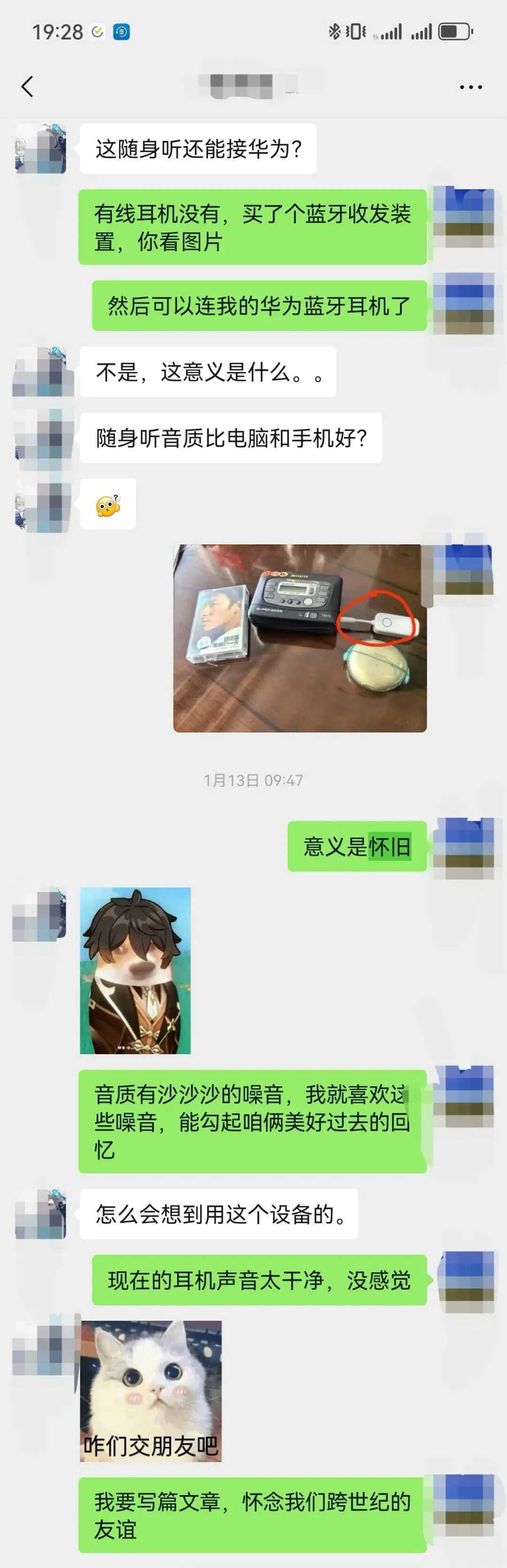 可是那股强烈的欲望驱使我开动脑筋,注视着这只陪我走过不少难忘岁月的“老朋友”,我灵机一动,是否存在一种小巧的“蓝牙发射器”,插入3.5mm耳机孔,将音频信号发射出来,然后用我的华为蓝牙耳机接收?说干就干,于是我打开万能的“某宝”搜索“蓝牙发射器”,果不其然,真存在这种小玩意儿,而且是发射与接收一体的,小巧可爱,立即下单。某宝再次没让我失望,它果然是一个“只有想不到,没有买不到”的神奇的地方。