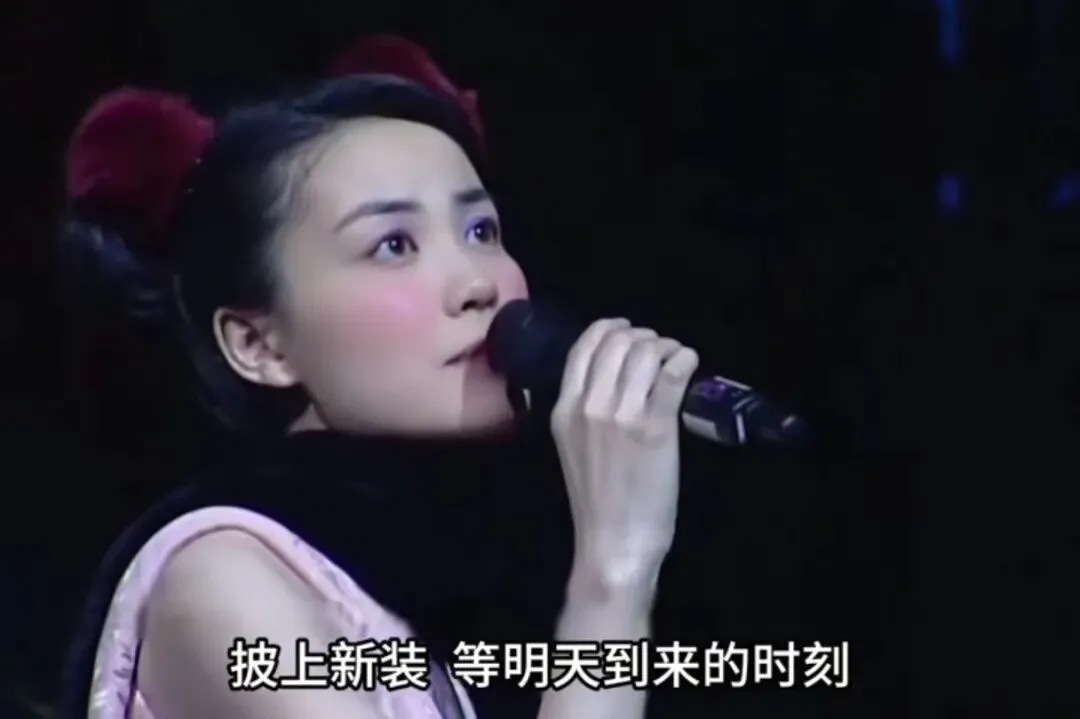 - 造型:标志性的双丸子头(哪吒头),搭配粉色上衣与黑色围巾,充满90年代的青春活力。