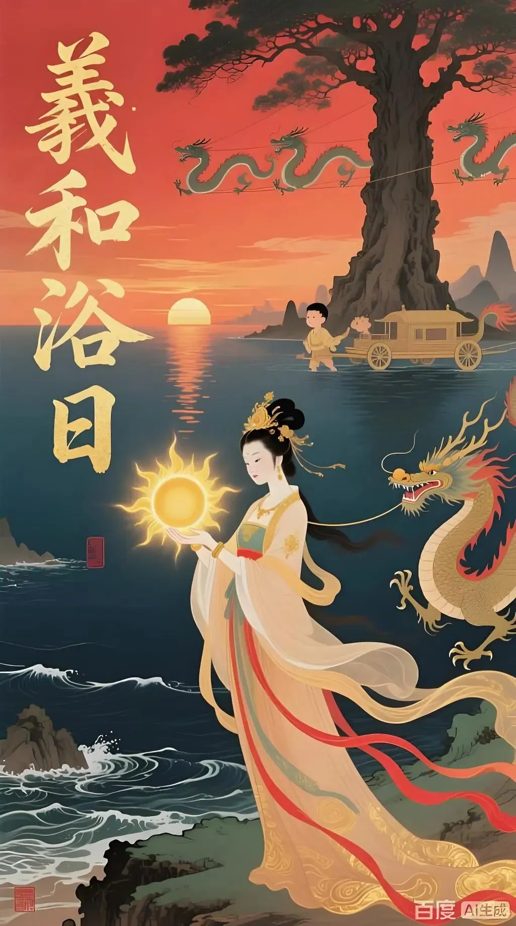 歌曲以诗意的笔触,构建了神话的时空坐标系。“羲和车上金铃铛”,唤醒了日神羲和。《山海经·大荒南经》中,她是“生十日”的太阳之母,后演变为驾驭日车、调控时序的“日御”。那清脆的“叮当”声,不仅是太阳金辉的听觉化,更是宇宙规律、时间秩序井然运行的象征。