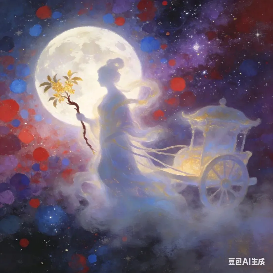 与之唱和的,是“望舒驾后银尾巴”。望舒之名,源出《楚辞·离骚》,是专为月亮驾车的女神。她身后摇曳的“银尾巴”,宛若月光流淌的轨迹,清冷、柔美而神秘。羲和与望舒,一金一银,一日一月,共同编织了天地间最根本的节律——昼夜交替,光阴流转。