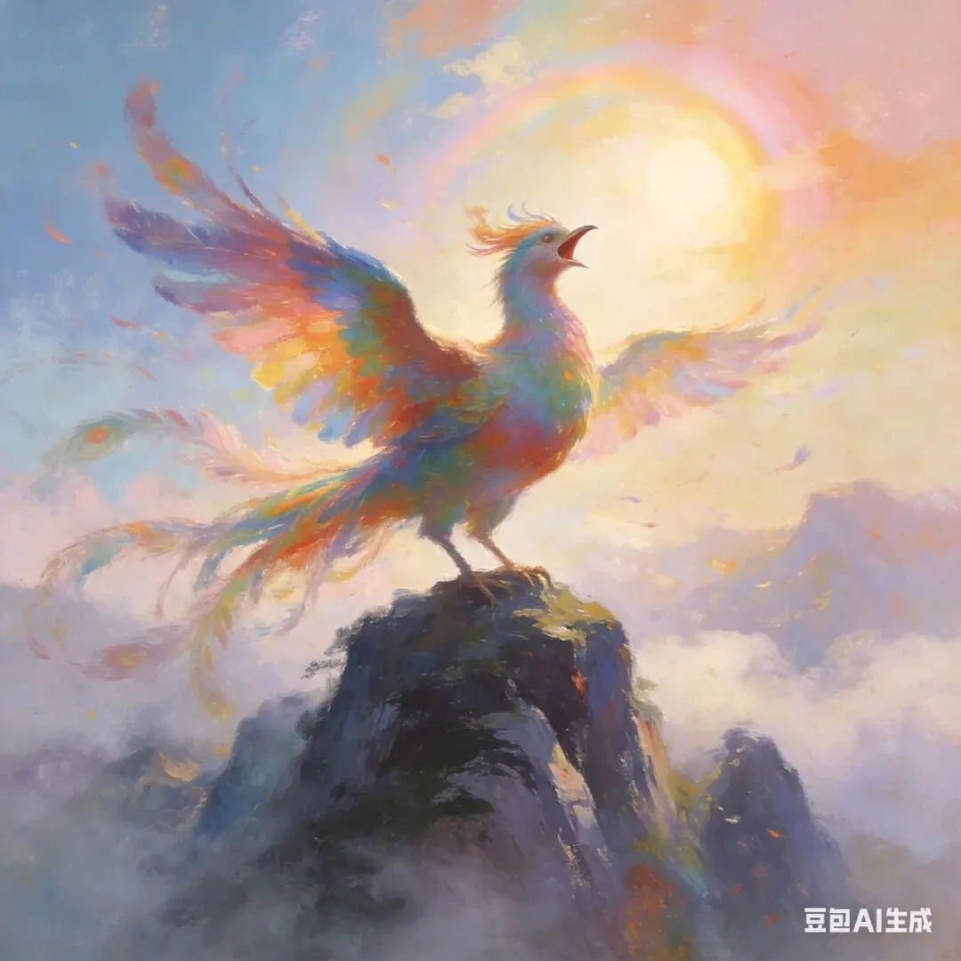 “高高山上鸾鸟唱”,为整个神话图景铺上了祥瑞的底色。鸾鸟,在《山海经》中被描述为“见则天下安宁”的五彩神鸟,它的歌声是太平盛世的音声预告。在高山之巅,鸾鸟的鸣唱与对吉量的呼唤形成天地间的优雅呼应,共同宣告了一个和谐、安宁、充满希望的神话时刻的到来。