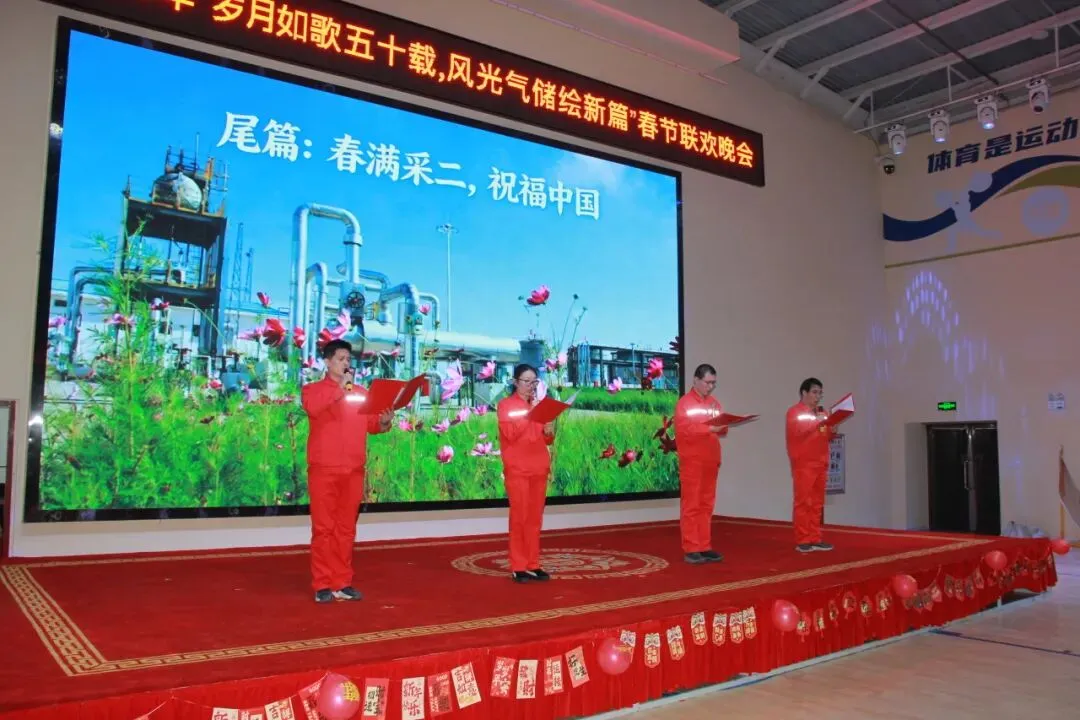 2月12日,咸阳基地张灯结彩,年味浓郁。舞台中央“岁月如歌五十载 风光气储绘新篇”的金色字样,诉说着从三普到采气二厂跨越半个世纪的厚重积淀。
