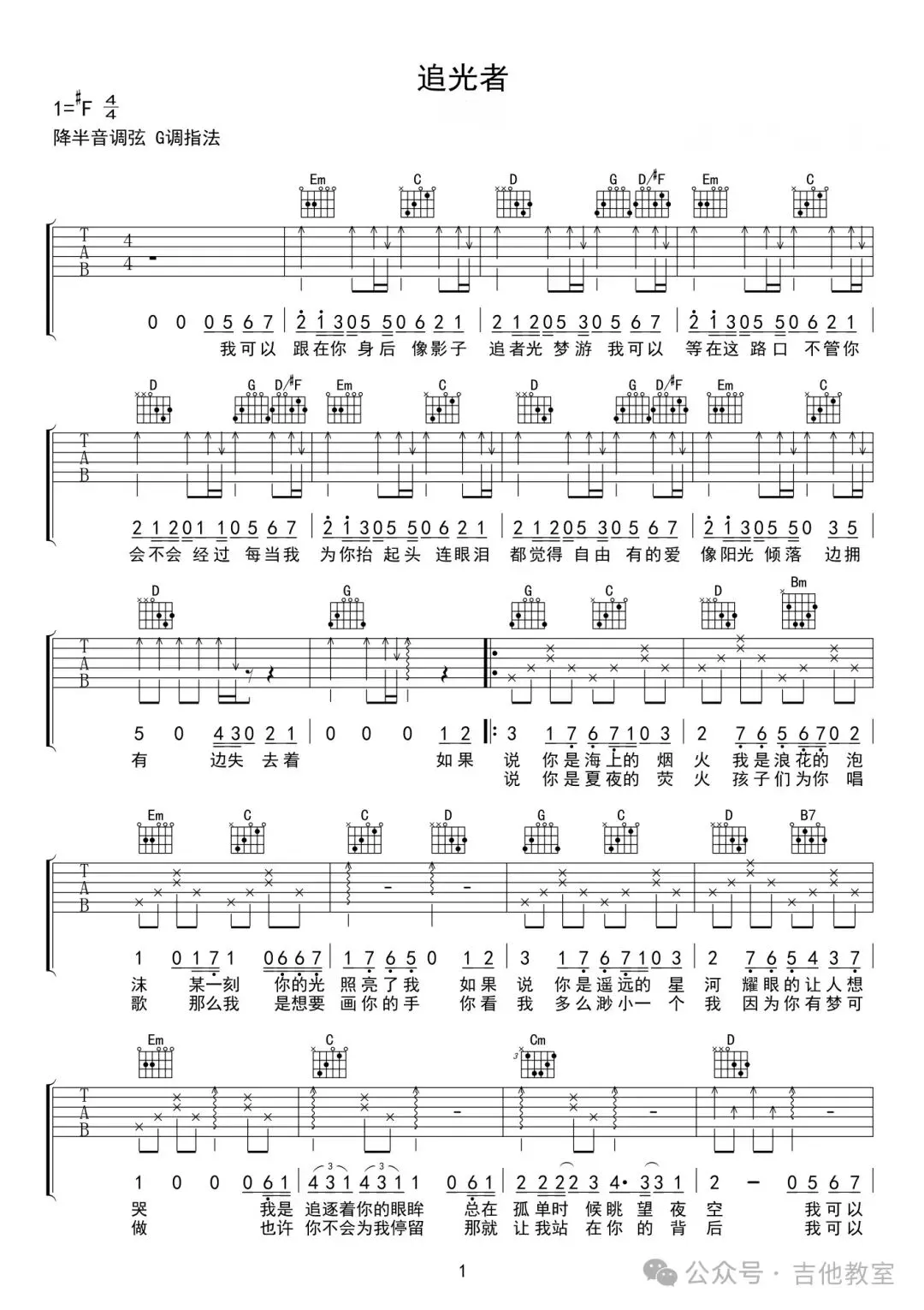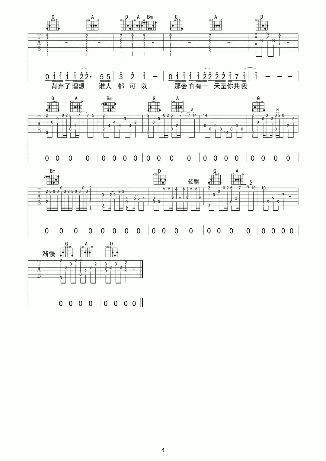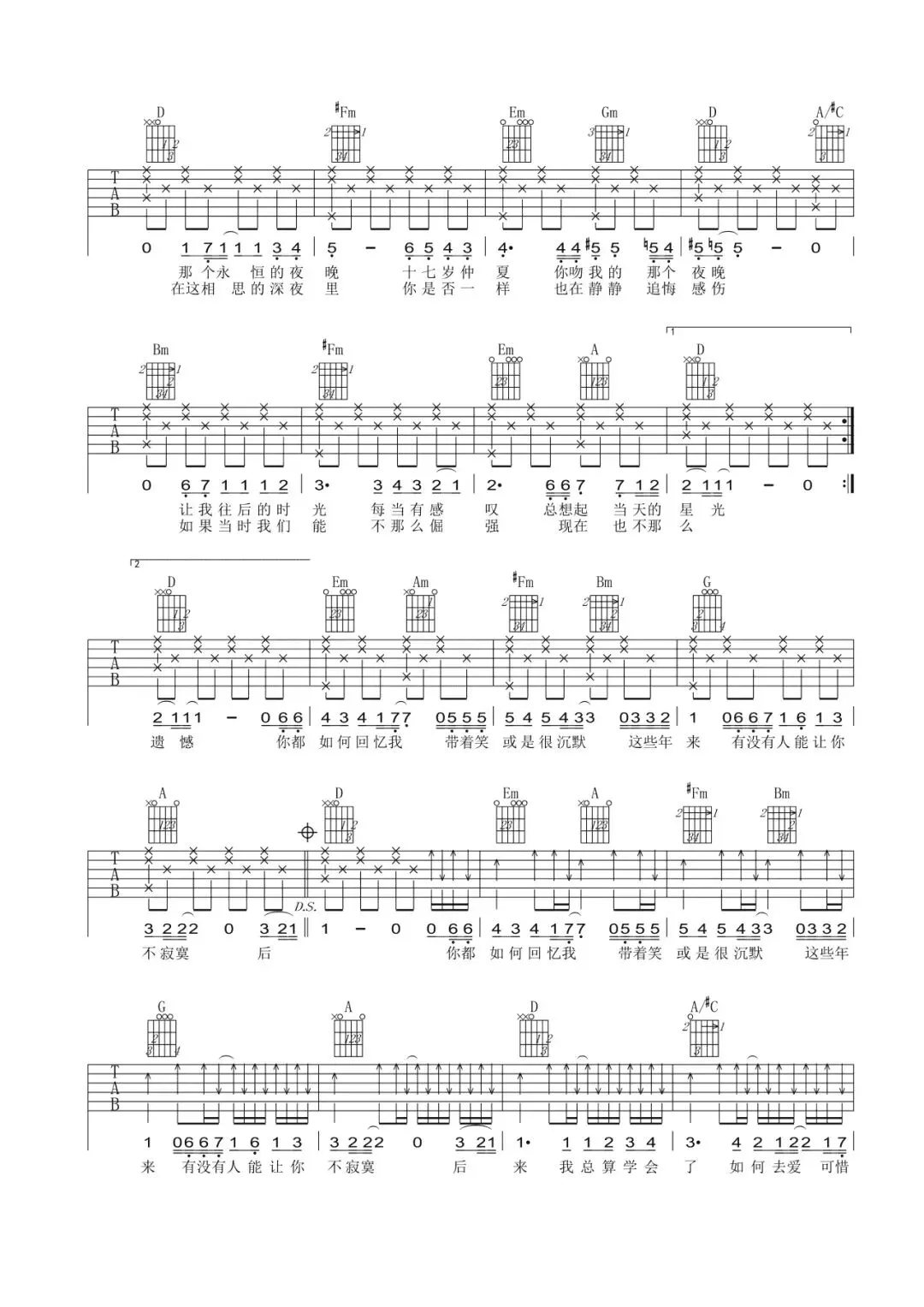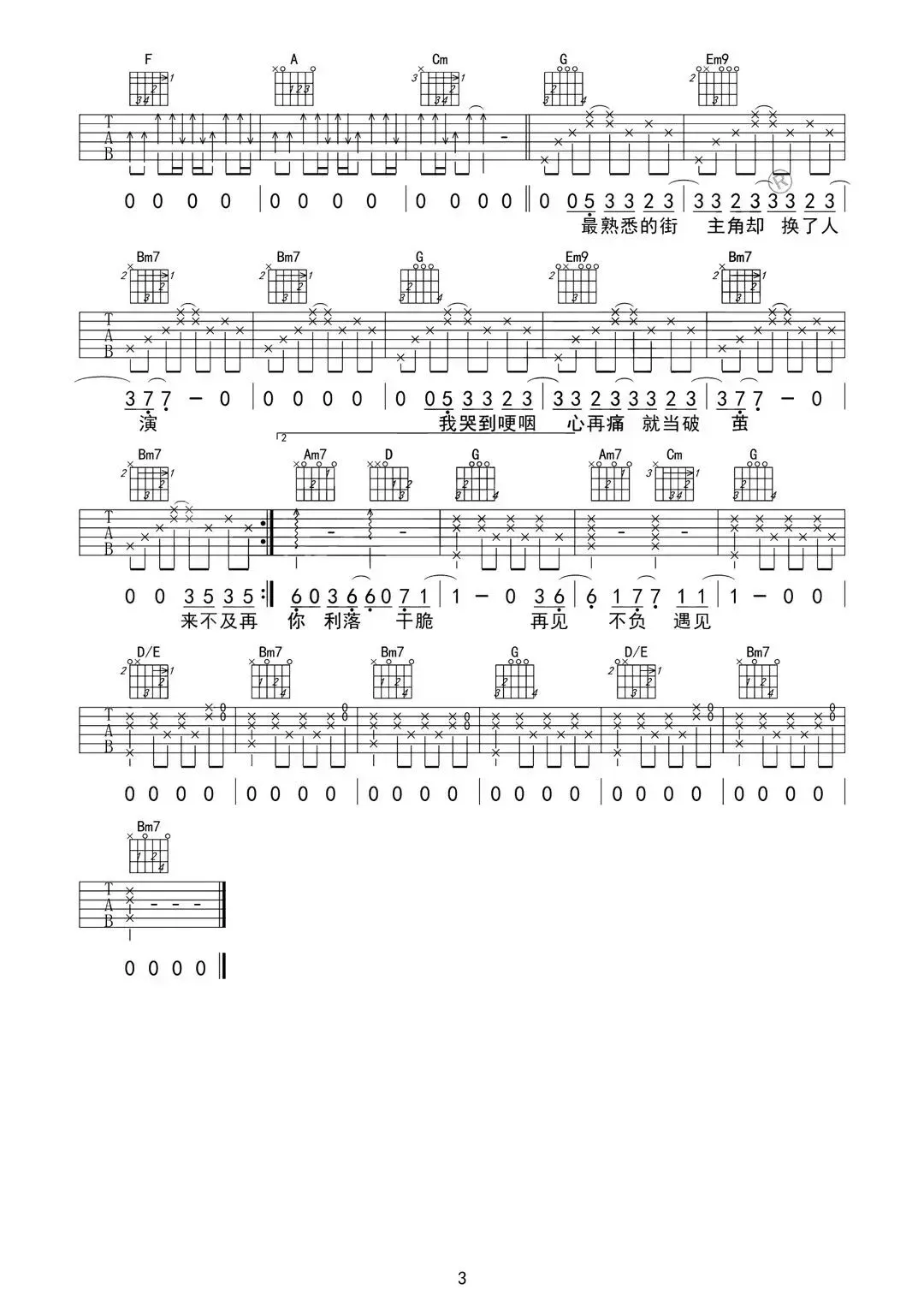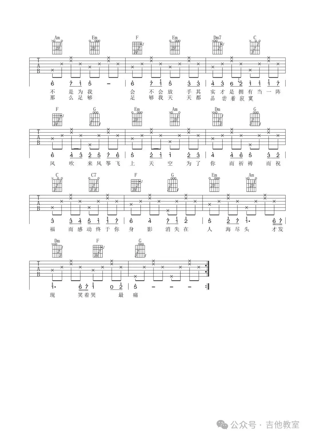 叙事型歌曲,前奏用双音伴奏增加层次。主歌部分采用"刷-扣-刷"的节奏型,副歌改用强力和弦扫弦。注意扫弦力度控制,情绪起伏全在右手动态。