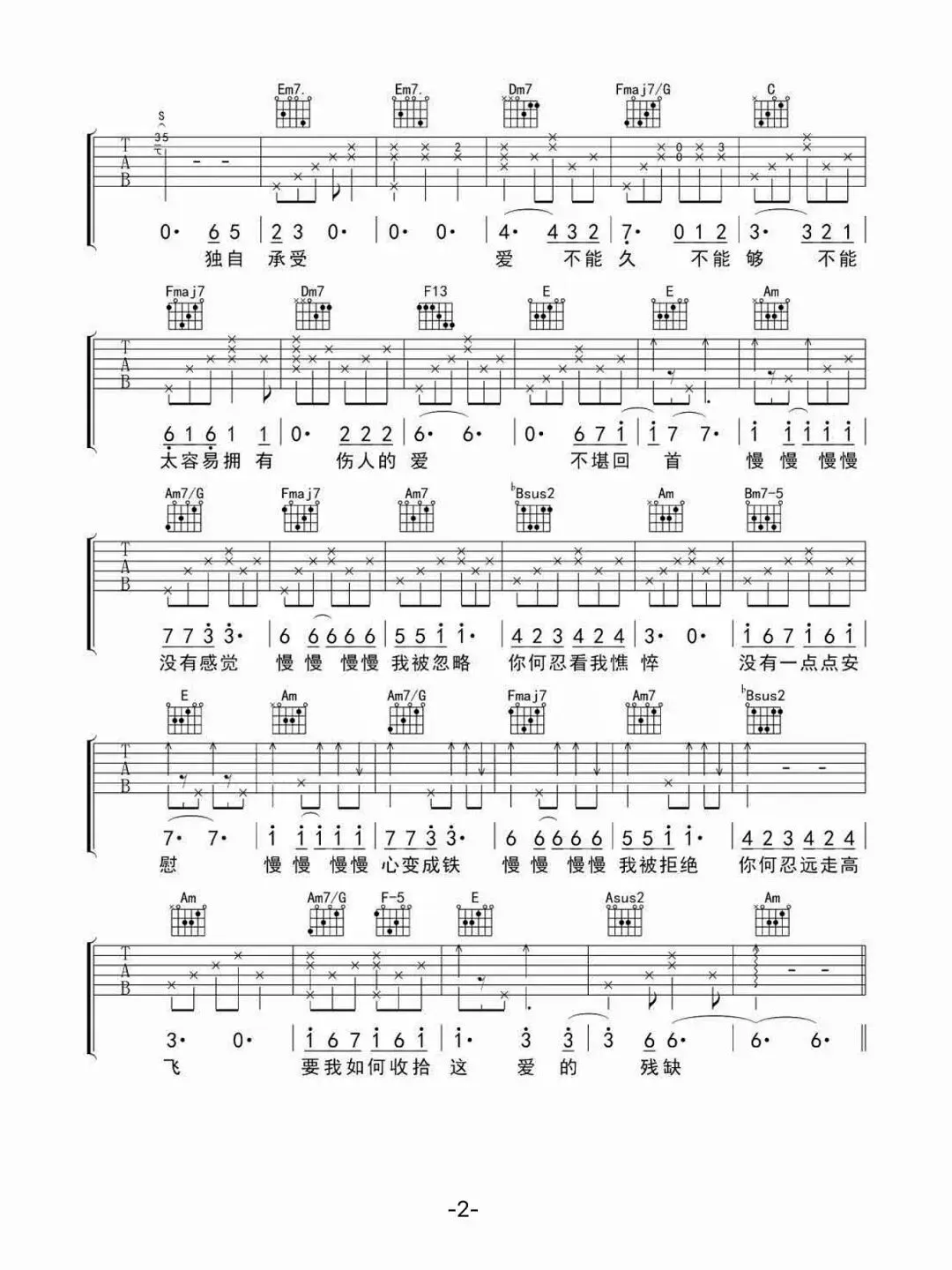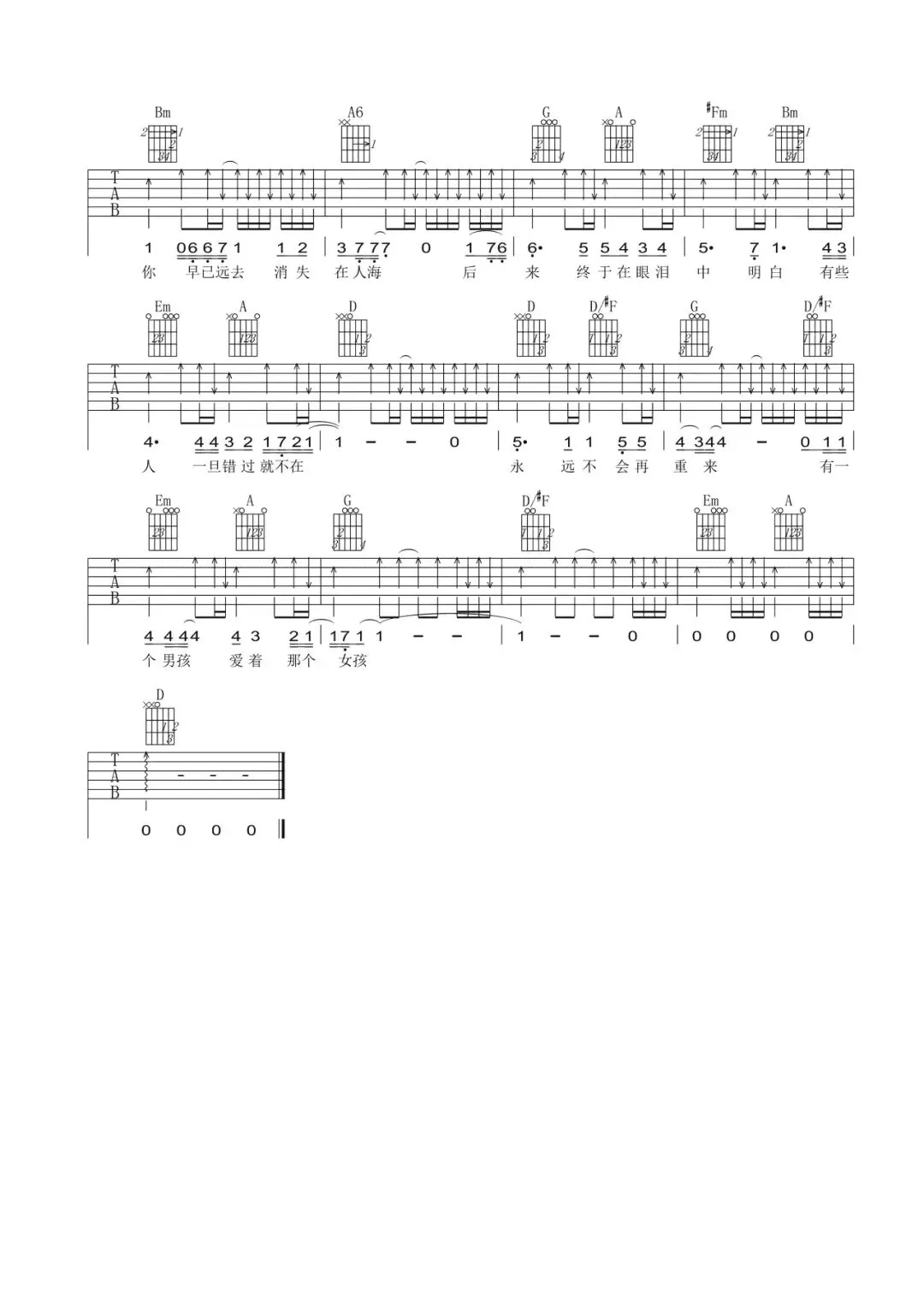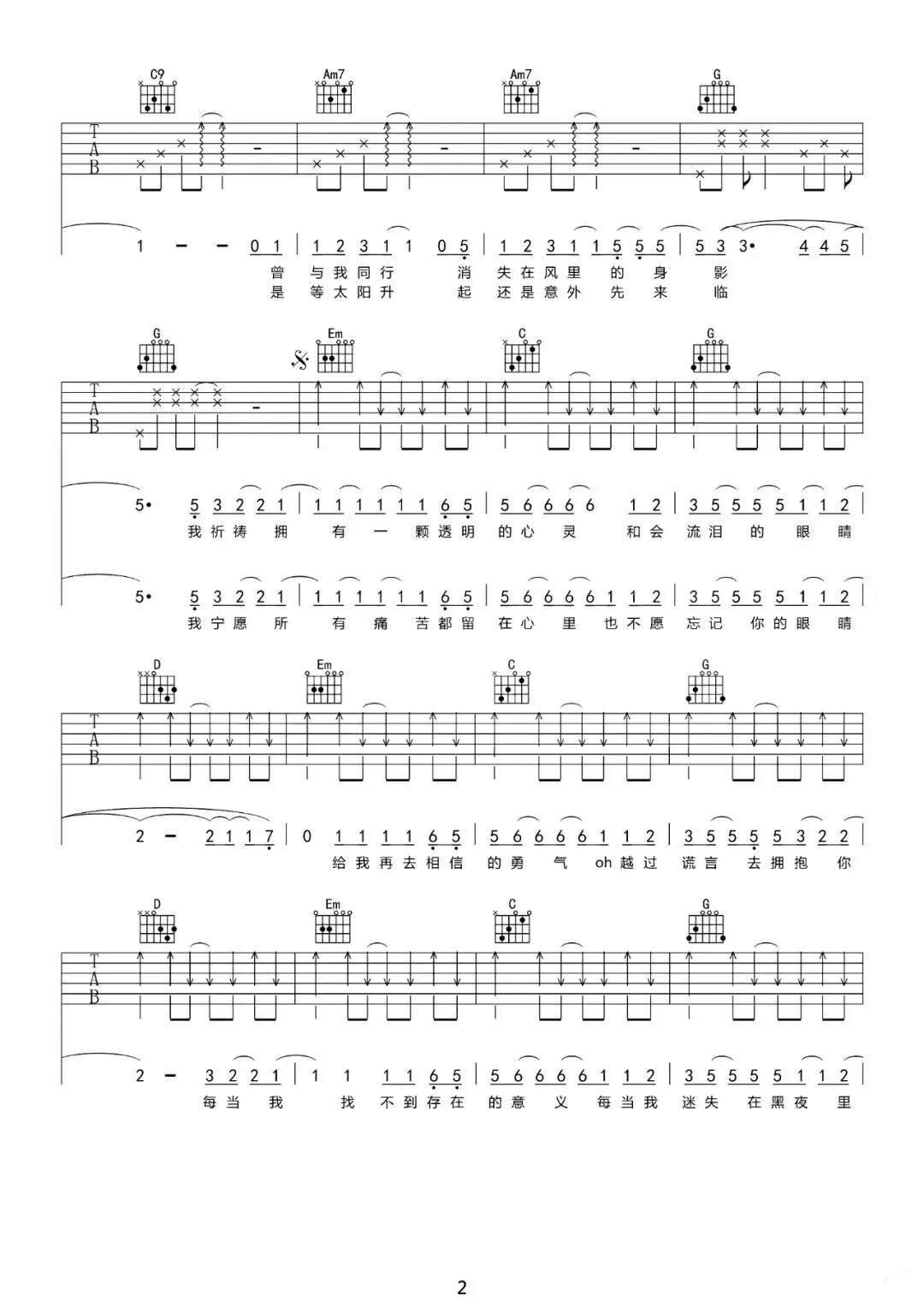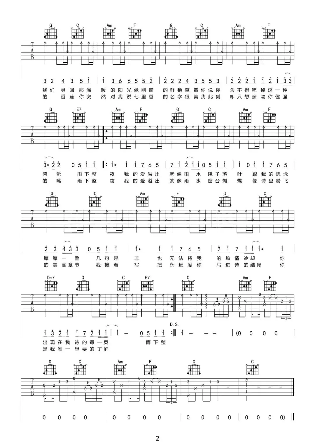 叙事型歌曲,前奏用双音伴奏增加层次。主歌部分采用"刷-扣-刷"的节奏型,副歌改用强力和弦扫弦。注意扫弦力度控制,情绪起伏全在右手动态。