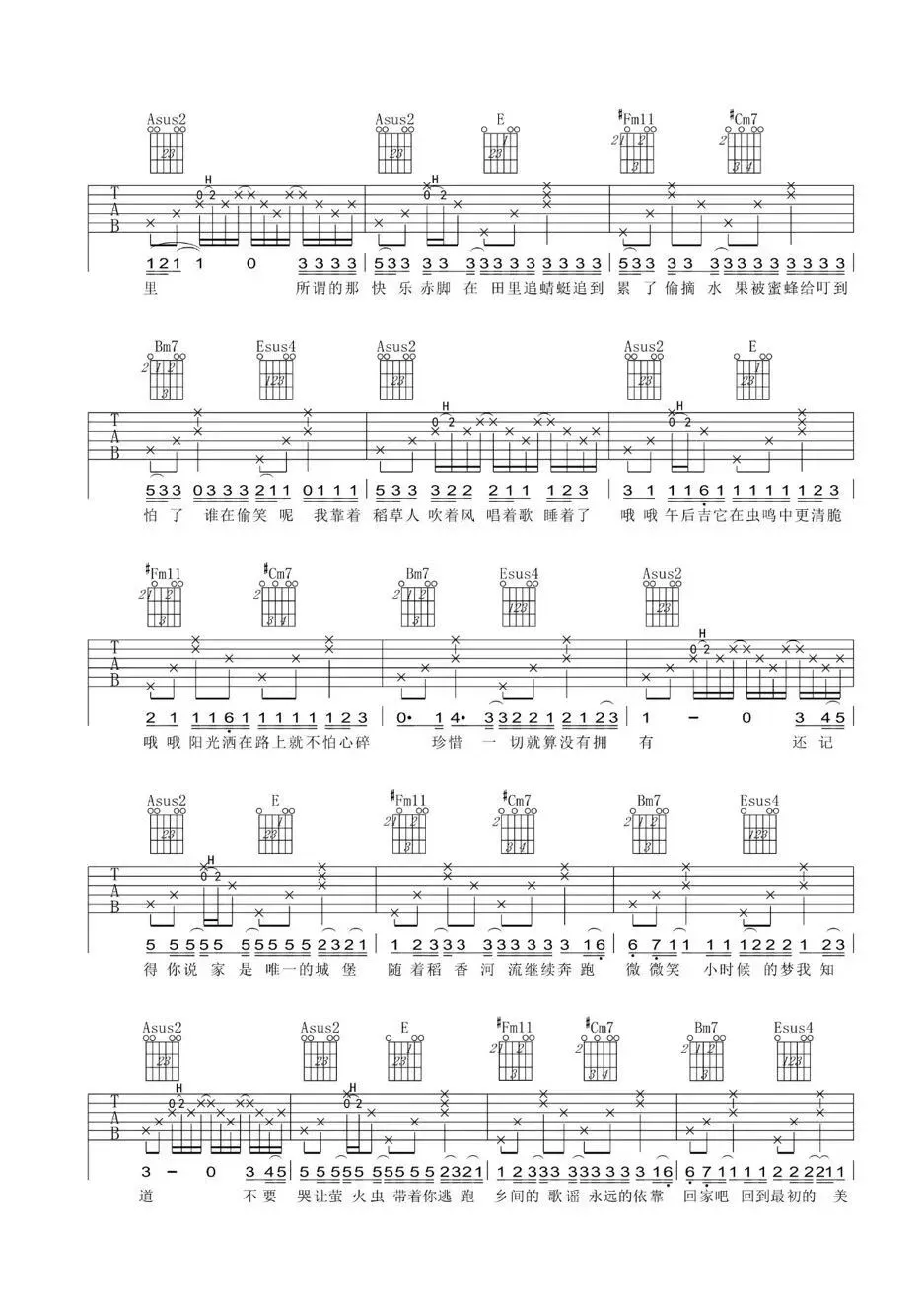 治愈系歌曲,前奏用分解和弦铺垫。主歌部分采用三连音节奏型,副歌转为切分扫弦。桥段加入拍弦技巧,最后一遍副歌改用双手点弦,制造时光流逝感。
