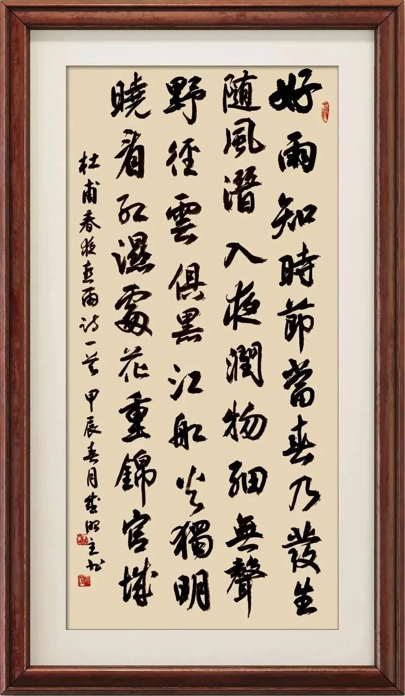 《春夜喜雨》是唐代诗人杜甫于唐肃宗上元二年(761)春在成都草堂居住期间创作的咏物诗。此时杜甫因陕西旱灾定居成都已有一年,亲事农耕并与当地农民交往,对及时滋润万物的春雨怀有深厚情感。全诗以拟人手法刻画春雨“知时节”的特性,通过“随风潜入夜,润物细无声”等句,细腻描写成都春夜雨景。尾联“晓看红湿处,花重锦官城”既展现雨后花枝饱含水分之态,又暗含对家国风调雨顺的期许。