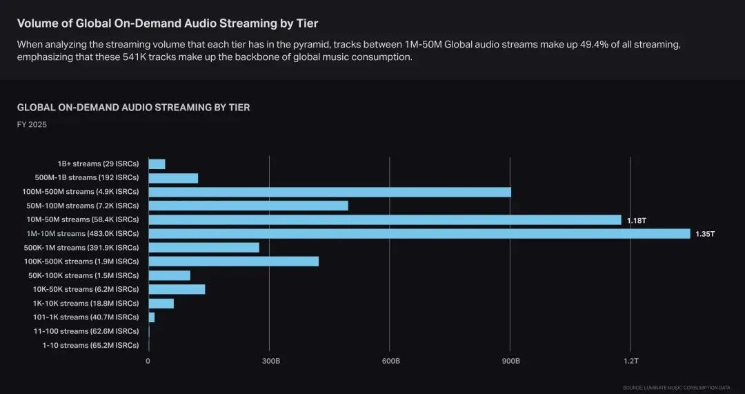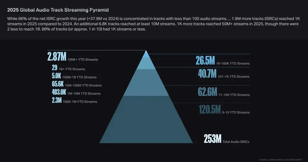截至 2025 年底,全球流媒体平台上已经有约 2.53 亿首在线曲目,并且每年新增约 3790 万首作品,平均每天约 10 万首上传 (Luminate, 2025; IFPI Global Music Report, 2025)。