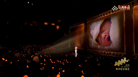 于是,随着放映机开启,观众区的环境灯光变暗,大量网友的日常影像出现在舞台上,歌词中第一次走路、第一次喊妈妈、第一次领奖状等人生节点,有了更丰富也直观的情绪支撑。略带斑驳的“胶片相框”,为影像增添了时光赋予的厚重感和仪式感,而由AI互动系统制作的“投映光束”,恰似妈妈望向孩子时温柔明亮的目光。