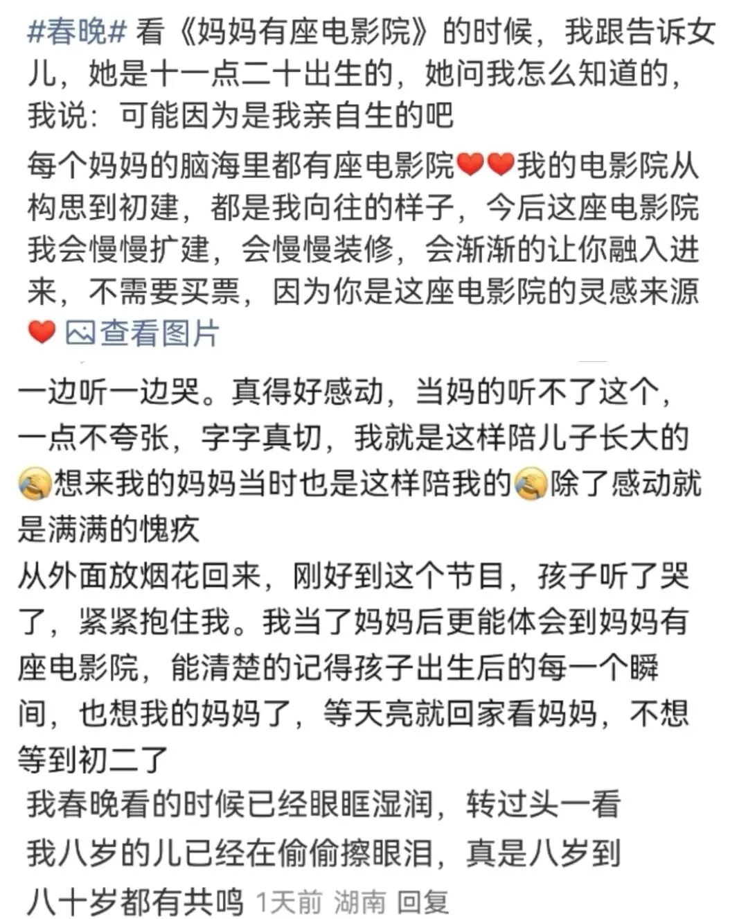 听完《妈妈有座电影院》,网友8岁的女儿趴在她身上问:“妈妈你是不是也有电影院,我要看看。”