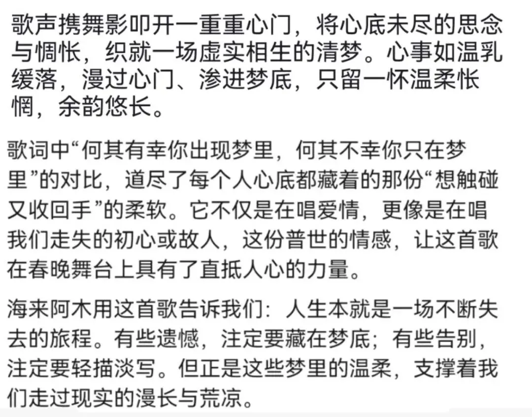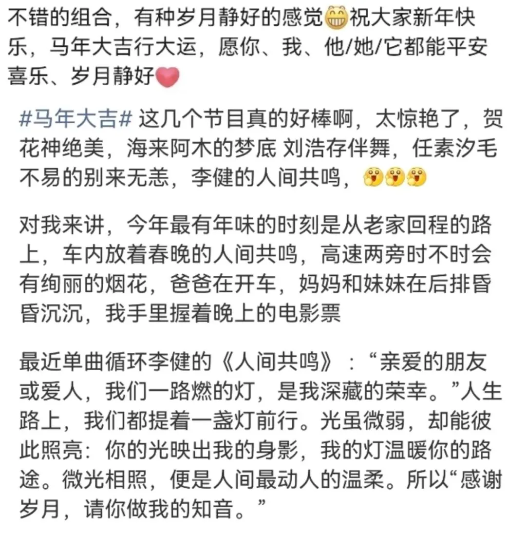 这几年,总台春晚的走心歌曲总会被大家单曲循环,而今年的惊喜在于,留在脑海中的旋律格外应景,不仅留下一幕幕令人难忘的绝美舞台,还能“自动匹配”这几天的所见所感,让每位观众都当了回旋律的主角——