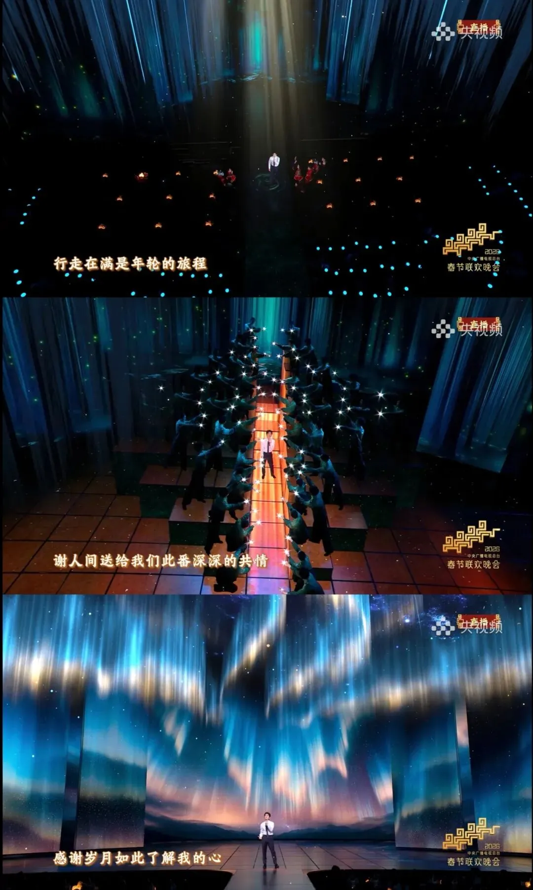 《你我经历的一刻》,是闪烁星光,也是百年长河。总台台长提炼原曲中最引人遐想的表述做歌名,一下拓展了舞台的表达空间。而我遇到你,像光遇到光,因为《人间共鸣》,所以豁然开朗。导演组紧扣“共鸣”设计视觉:密林深处的光束,恰似独行者的心灵微光,与象征共鸣者的灯阵共振后,天地辽阔,生出星空与极光。网友评价,舞台空旷只留微光,正让所有焦点都落在了歌的意境里。