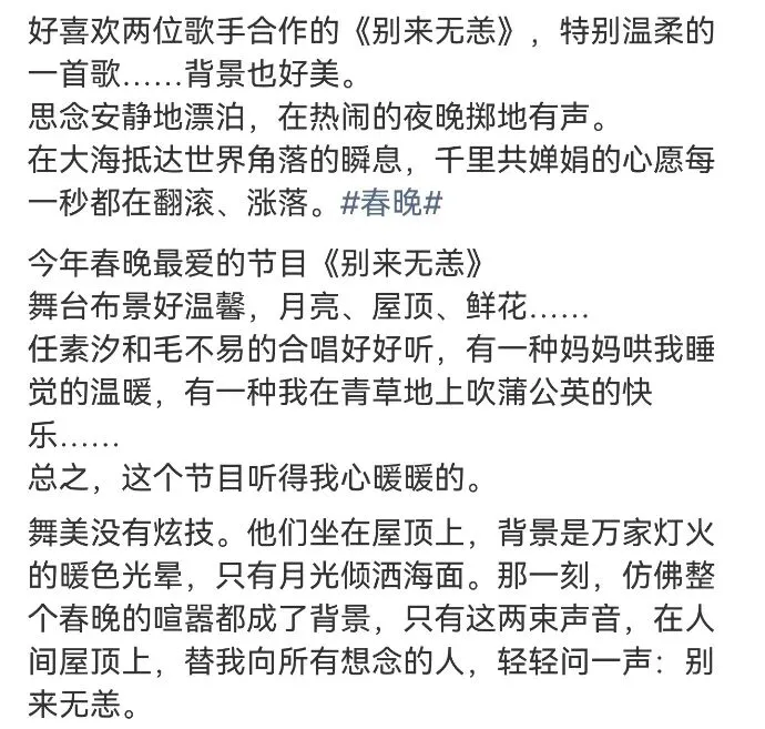 春晚总导演于蕾透露,每年春晚歌曲创作前,都会通过大数据分析年度热歌里的流行偏好和社情民意,指导新一轮创作。听一听,看一看,直面千万种真情生活的创作,总能迎来创作者的初心回响。愿每一处映在眼底的风景,都有除夕夜的走心音符作伴,有可亲可感的旋律共听。