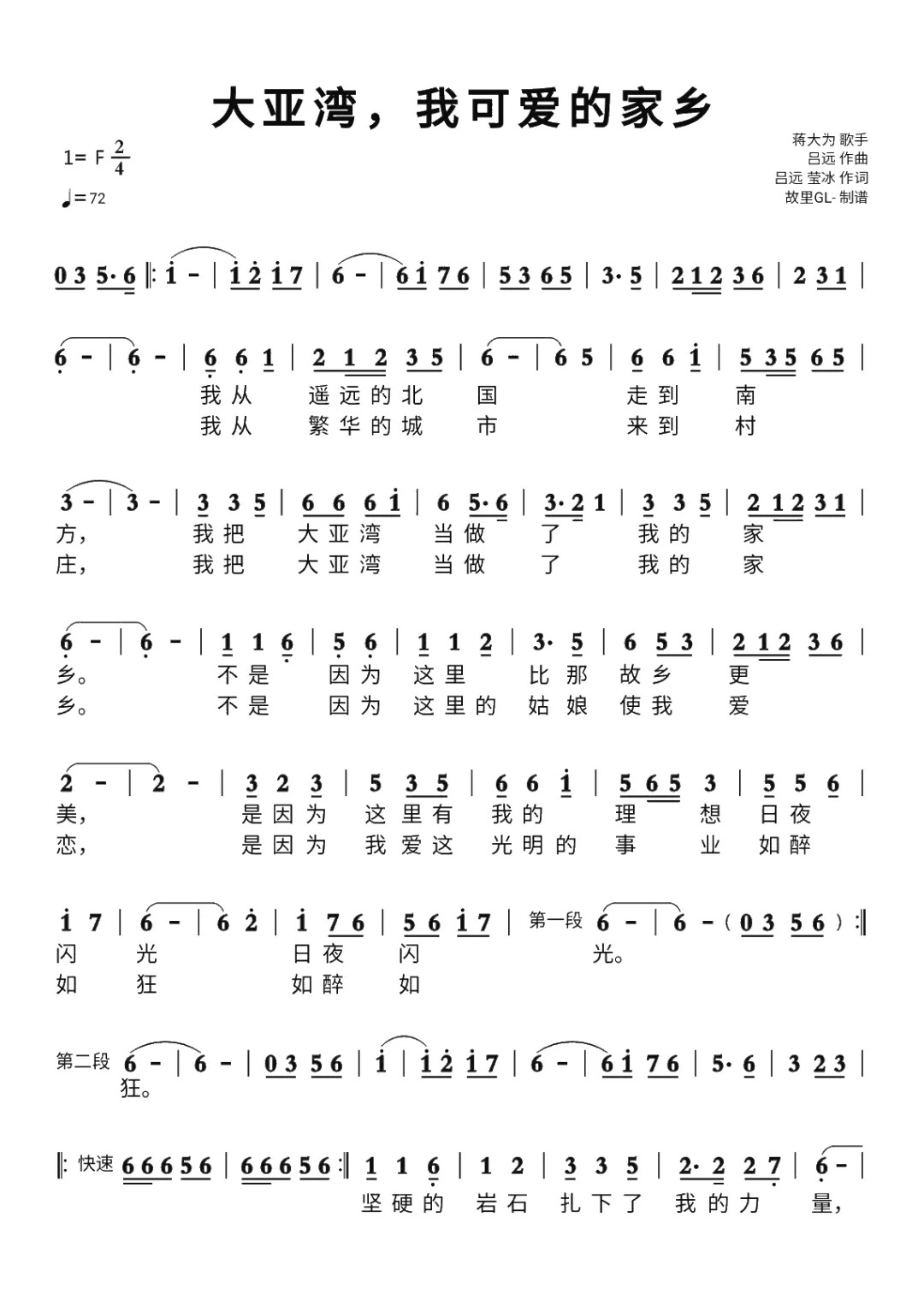 大亚湾是一片海,是一座城,是一个寻梦的地方。大亚湾乃广东沿海声誉鹊起的商业帝国,一个人们向往的旅游胜地,一个以商潮与浪潮交融的符号。真可谓人间天上一湾水,万千景象在其中。自改革开放以来,经济与旅游在这里逐渐兴起,与时俱进的大亚湾在近些年来实现了从迈出深闺到勇赶潮流的华丽转身。一首歌颂大亚湾崛起,寻梦的《大亚湾,我可爱的家乡》是由著名的词曲作家吕远创作、著名歌唱家蒋大为演唱的歌曲。该曲再现了大亚湾改革开放以来有志青年投身大亚湾、建设大亚湾的壮丽画卷。