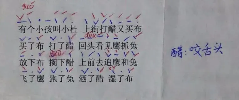 一开始练习时,孩子们以为语速越快越好,结果出现了咬字不清、声调不准等问题。为了改正这些问题,孩子们打印出歌词,逐字标记好声调,一遍遍练习。