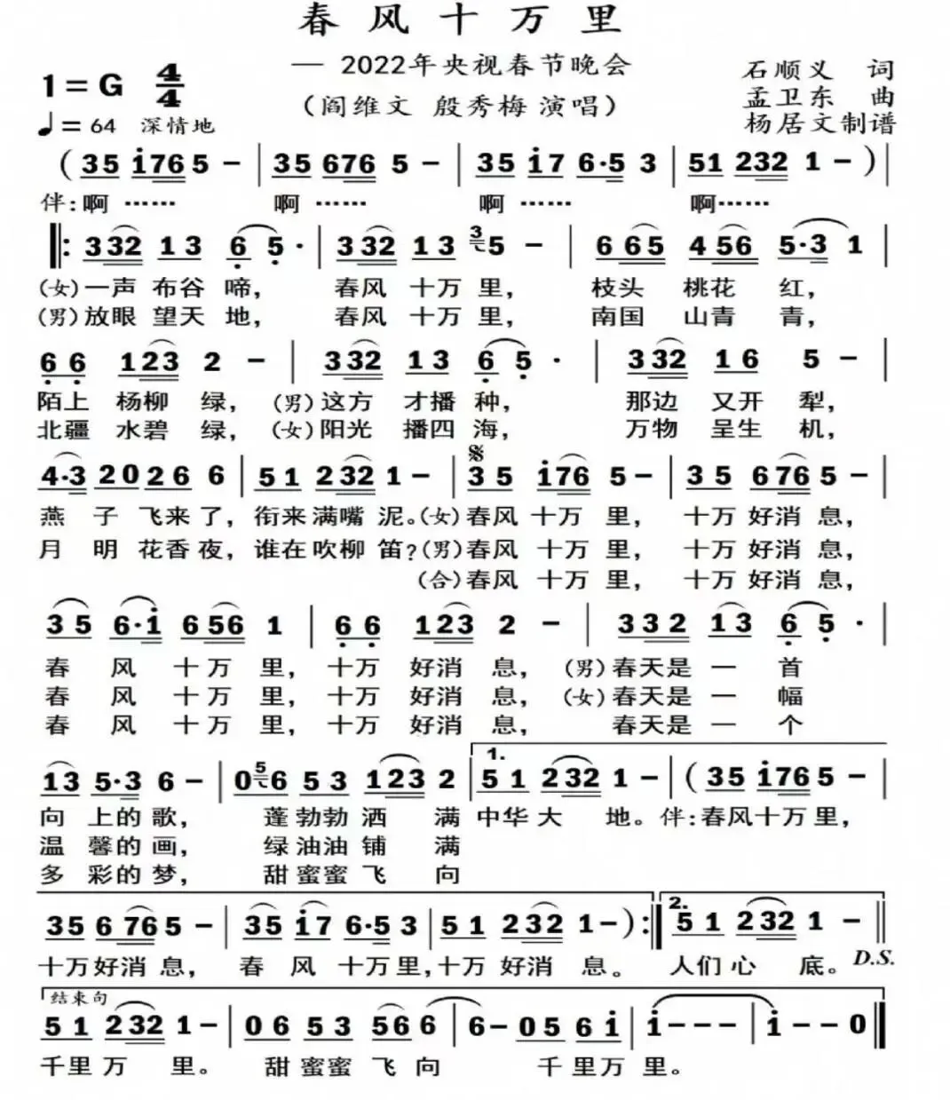 《春风十万里》是由石顺义作词,孟卫东作曲,我国著名男高音歌唱家阎维文和著名女高音歌唱家殷秀梅在2022年央视春节晚会上强强联手,完美合作演唱的一首大气磅礴、积极向上的春天歌曲。这首歌以优美的旋律、浓郁的乡土气息、蓬勃的朝气,一下子抓住了观众们的心。该歌曲被广大优秀歌唱家和声乐爱好者传唱。