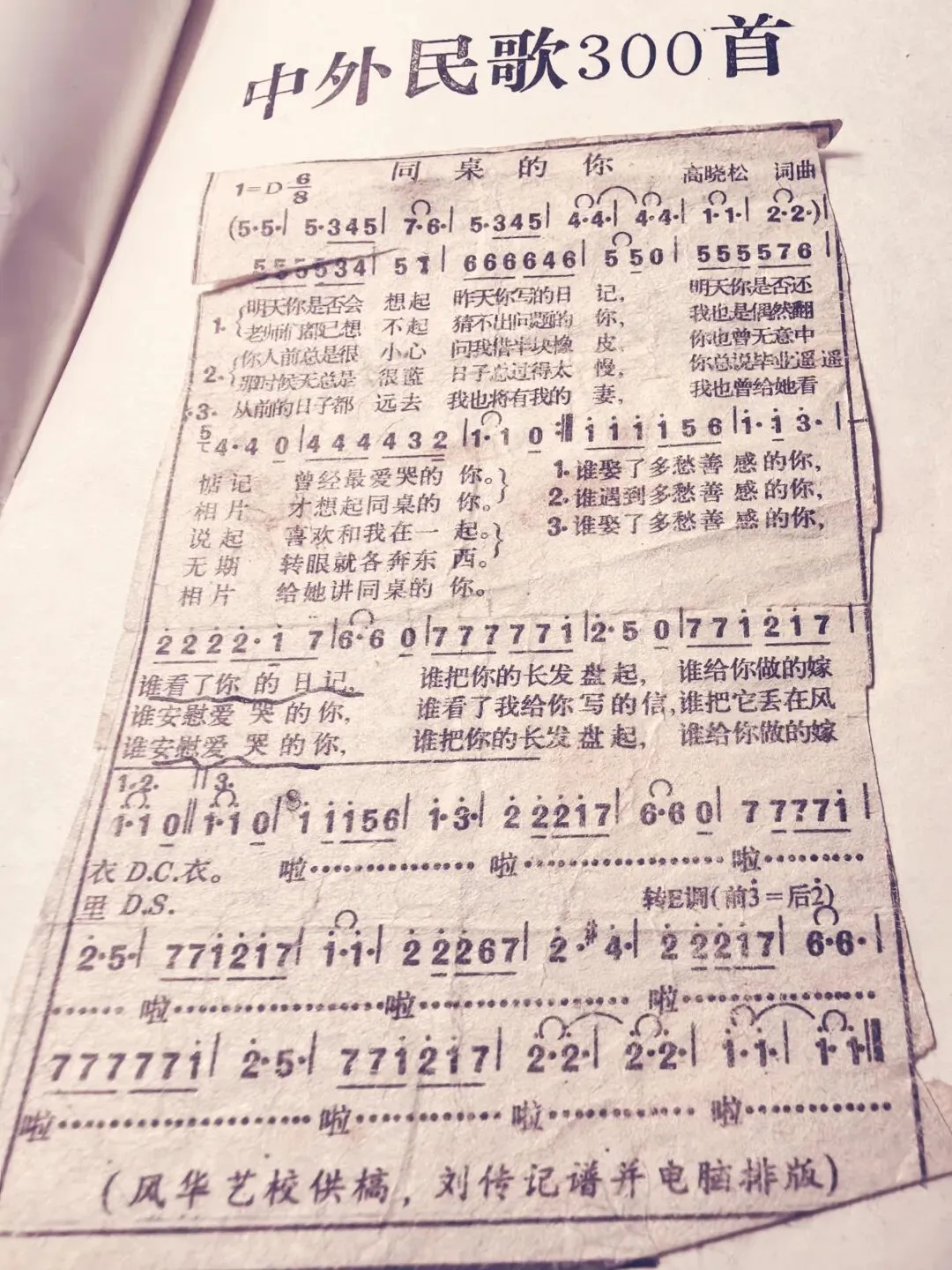 歌书里夹着一张暗黄的剪报《同桌的你》,旧旧的纸。那时候,放暑假,骑自行车到很远的村庄找中学女同学去玩儿,跟她学了《同桌的你》这歌,回来一路骑一路唱,阳光,马路,白杨树,盛夏,青春的欢乐时光。