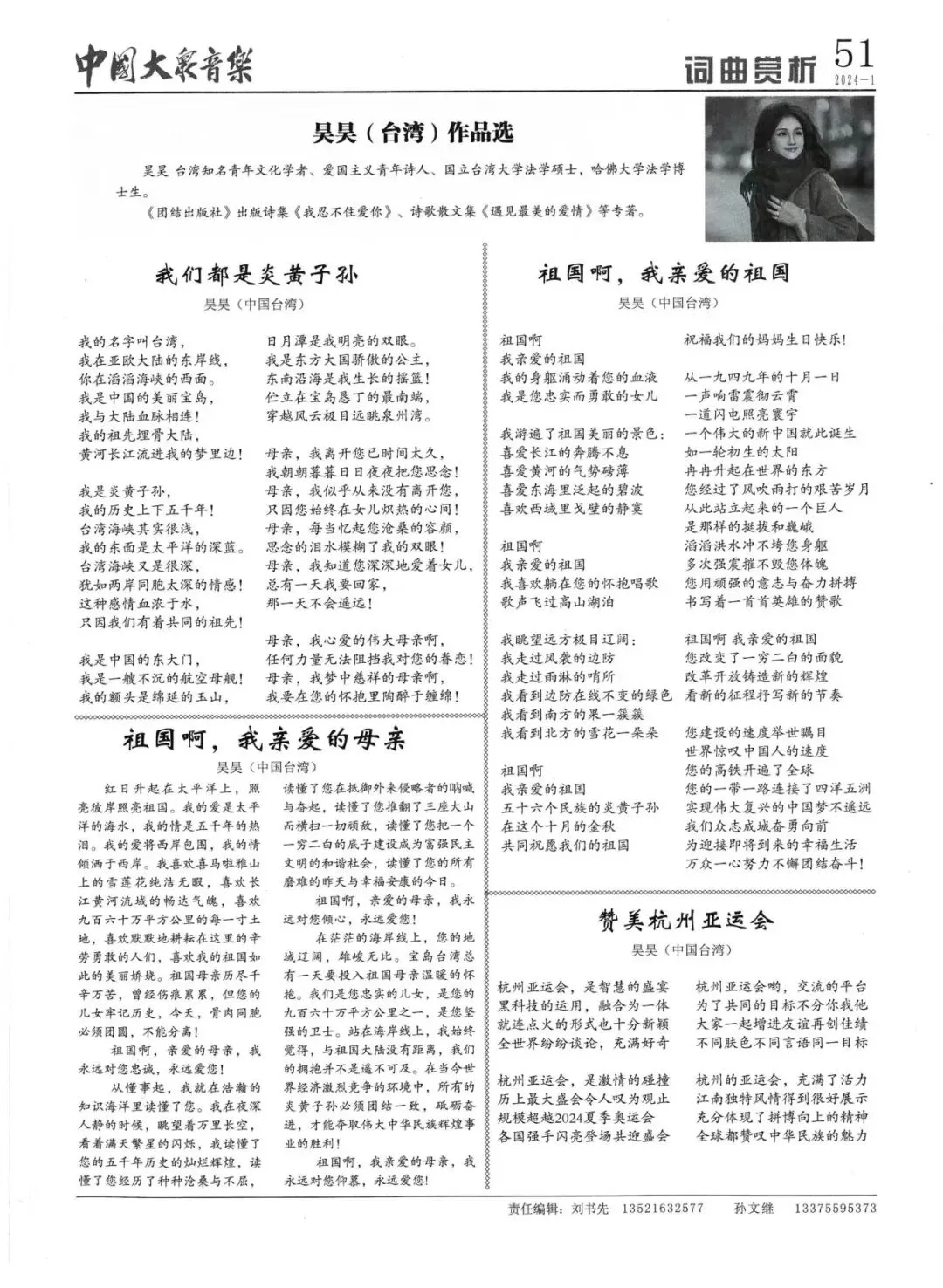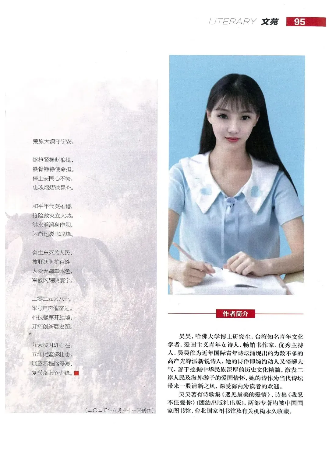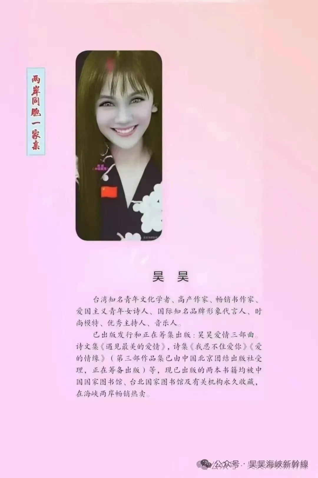 昊昊,台湾著名青年文化学者、高产作家、畅销书作家、爱国主义青年诗人、国际知名品牌形象代言人、时尚模特、优秀主持人、音乐人,国立台湾大学法律系本科毕业,获得该校法学本科学历及法学学士学位。后考取该校硕士研究生,通过努力学习,成功获得该校法学硕士研究生学历及学位。后来,作为互派交流生,又远赴新加坡,到国立新加坡大学及亚洲有关国家知名大学接受系统学习。同时,为了不断提高自己,她继续深造学习,现已考入世界一流名校哈佛大学攻读法学,以期获得该校法学博士研究生学历与学位。另外,她还参加了台湾青年综合高级培训班,在通过重点学习后,利用寒暑假期从事中华文化的研究与两岸文化交流工作。昊昊作为近年来台湾涌现出的为数不多的高产先锋派新锐诗人,从她多年来创作的大量的作品来看,作为一位优秀的女性青年作家,她的诗植根于传统,擅长于挖掘中华民族博大精深的文化题材,同时立足于现代,扎根于生活,及时准确反映时代,歌颂爱情、劳动与生活,其作品思想鲜明,风格多样,有时显得雄浑大气,气势磅礴,沉雄浑厚,有时又显得清丽脱俗,空灵秀丽,婉约甜美。总之,昊昊的作品多以弘扬歌颂中华传统优秀文化、表达强烈的爱国主义情怀和精神的作品以及歌颂爱情的作品为多见,擅长在精微之处抒发情感,感情细腻,妙趣丰盈,体材与题材多样,内涵丰富,极大激发了两岸人民及海外学子的爱国主义情怀,具有积极的历史意义和重要的现实意义,以此而被许多人转载和收藏。另外,还有许多被知名作曲家谱曲,成为优秀的歌曲作品。总之,昊昊的作品在海内外颇受欢迎,为现当代诗坛带来了一股新风,彰显出鲜活而强大的生命力,并多次获奖。昊昊已在全球出版发行了散文及诗歌集《遇见最美的爱情》、诗集《我忍不住爱你》,两本书籍出版后均被中国国家图书馆、台北国家图书馆及海内外有关机构永久收藏,在海峡两岸畅销热卖。值得欣喜和庆贺的是,近期,昊昊的两部诗集《爱的情缘》及《爱的秘密》又问鼎诗坛,正式结集出版发行。相信,这两部力作,将为整个诗坛带来它应有的影响,成为文学的星空闪亮的星辰及文坛的盛宴和广大读者丰富而又宝贵的精神食粮!