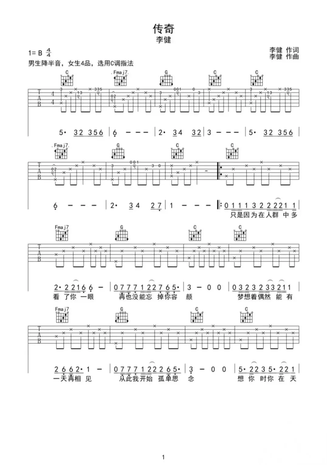 传奇吉他谱