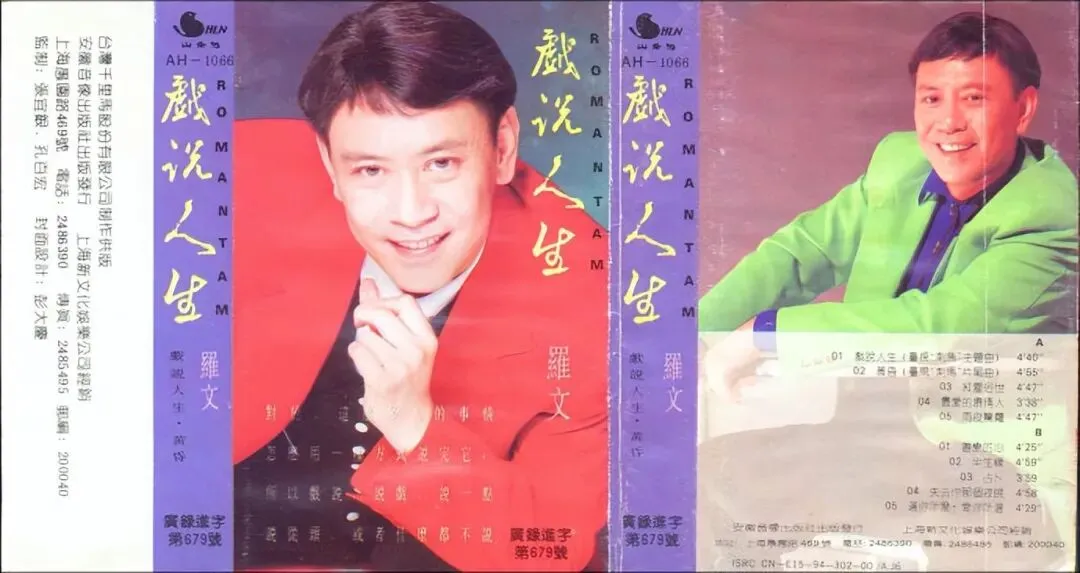 比起之前那张忧郁风格的光盘,这盒封面特别喜庆, 一面穿红色西装,一面穿绿色西装,视觉对比特别强,两张照片里他都笑容满面,帅气又精神。专辑名叫《戏说人生》,只是年代久了,里面的歌曲看得不太清楚。大家对罗文的哪些歌最熟悉呢?