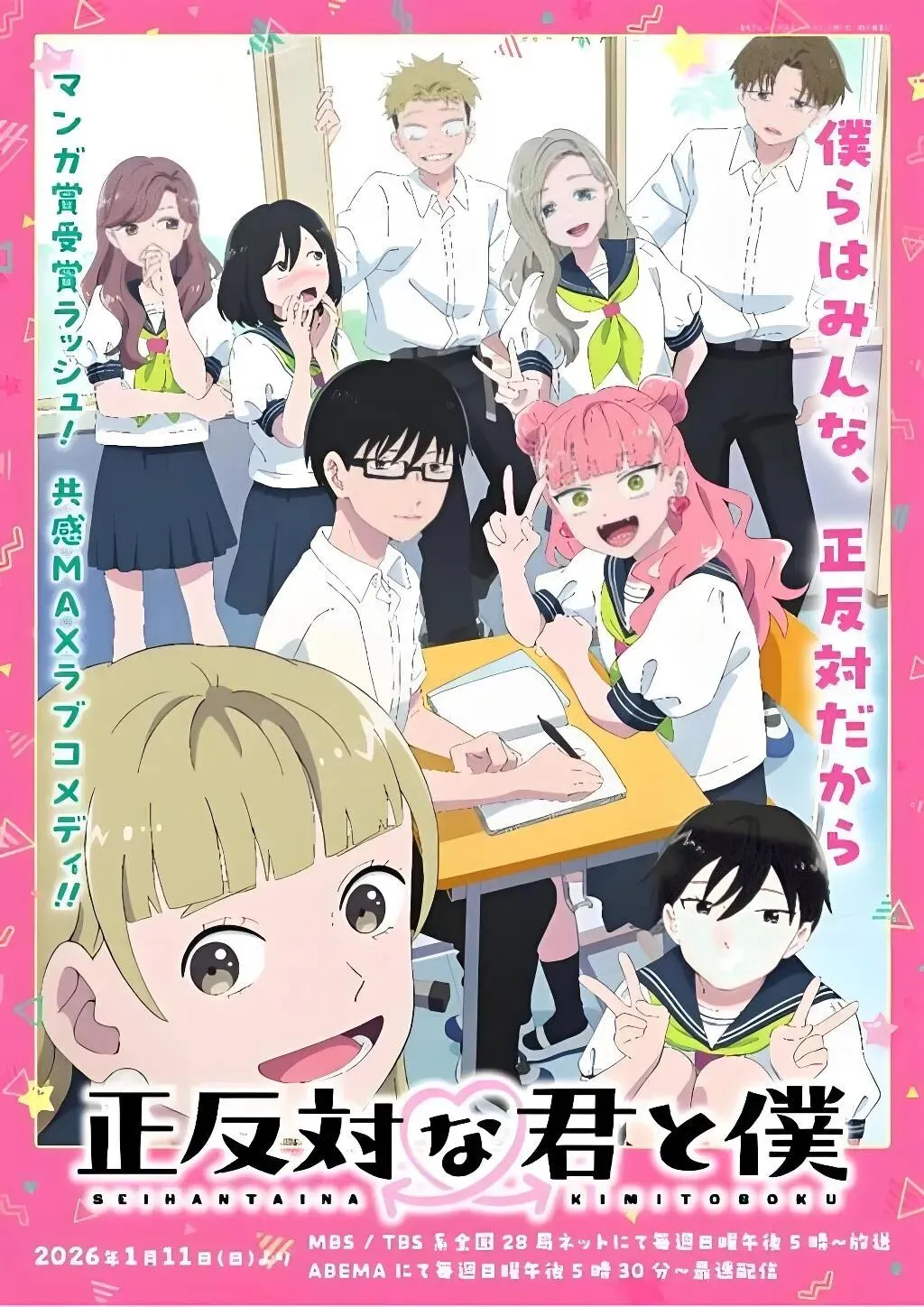 电视动画片《正相反的你与我》改编自阿贺泽红茶创作的同名漫画作品,2024年11月25日,官方宣布该片制作该片的消息 [1]。该片由长友孝和执导、内海照子担任总编剧、みやこまこ负责角色设计、Lapin Track负责动画制作,于2026年1月11日起播出。