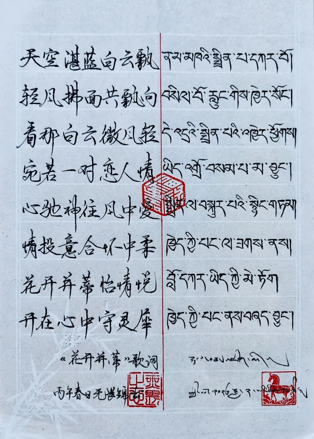 今日与您分享的是,藏语歌曲《花开并蒂》藏汉对照歌词节选的硬笔手写与翻译探讨。
