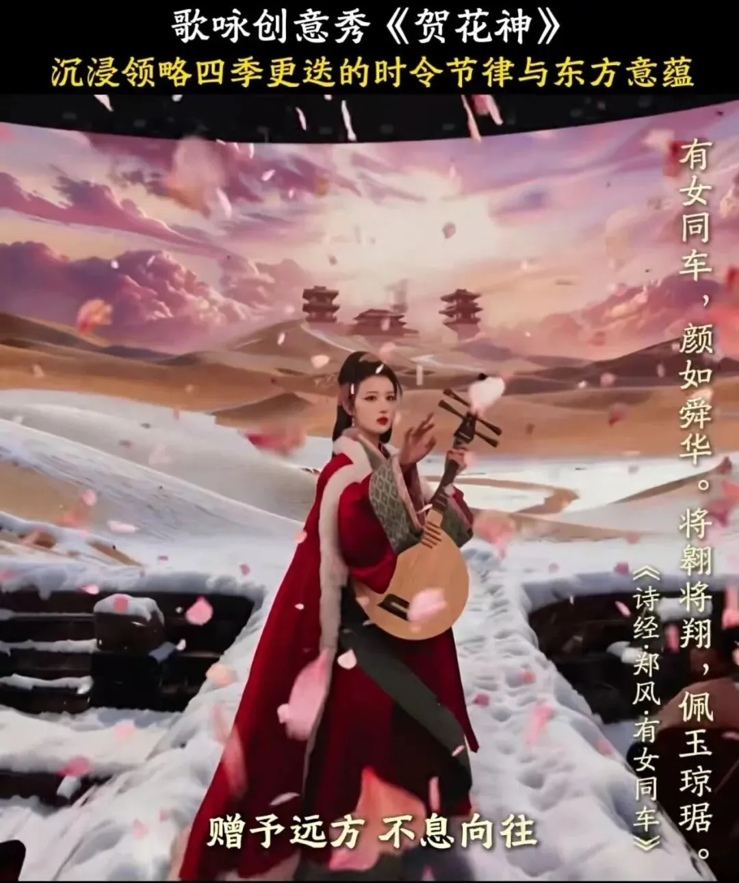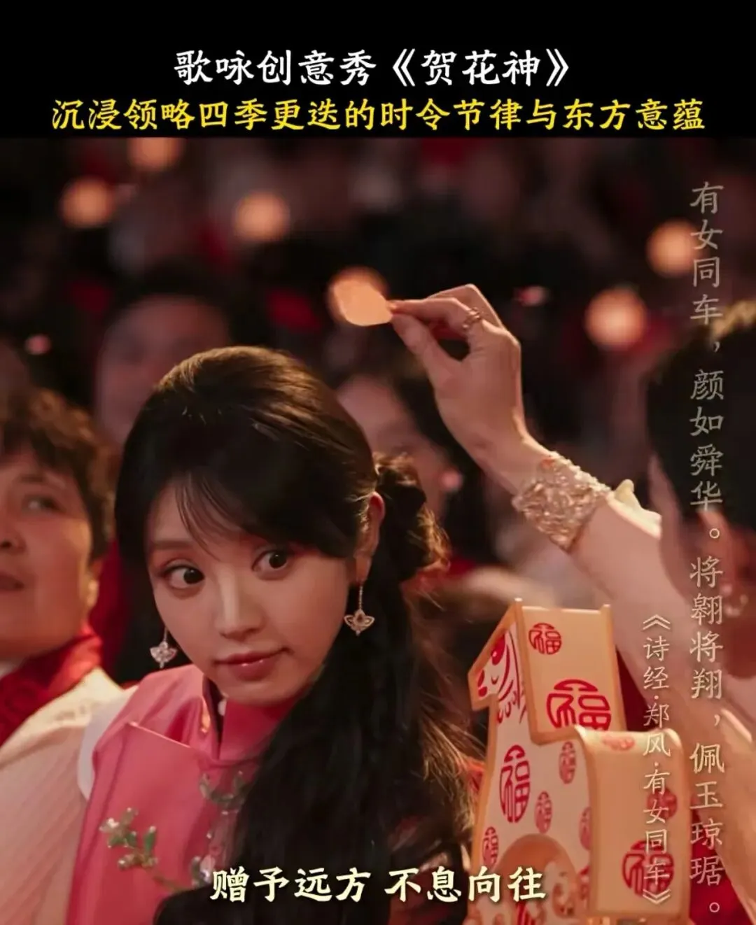 联动春晚:《诗经》里面有很多绝美的诗词,比如春晚节目《贺花神》里面的两个神级名场面,点缀的也是的《诗经·郑风·有女同车》里的词:有女同车,颜如舜华。将翱将翔,佩玉琼琚。